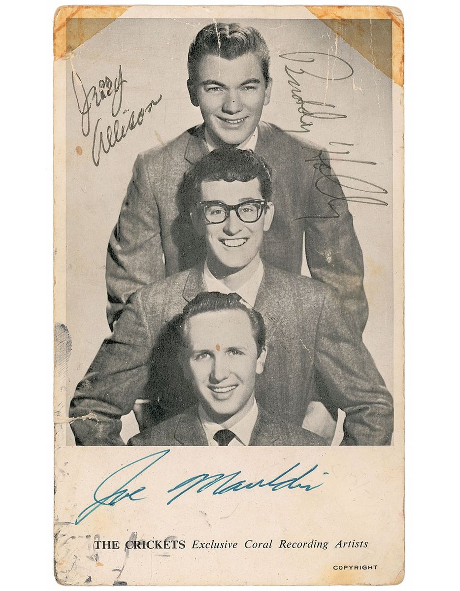 Vintage 3.25 x 5.5 Coral Records promotional postcard photo from February 1958, signed in black ballpoint, “Buddy Holly,” and “Jerry Allison,” and in blue ballpoint, “Joe Mauldin.” In very good condition, with scattered creases and ink marks, old tape toning to top corners, tape remnants to reverse, and a small tear to left edge. An early and particularly desirable example.