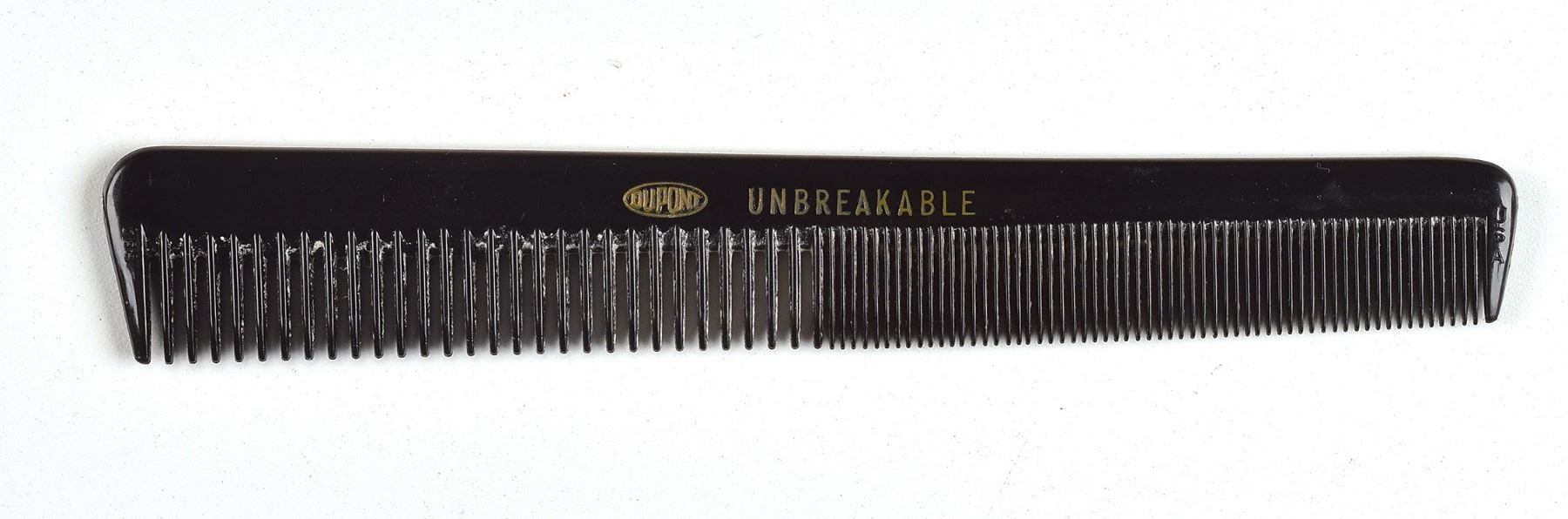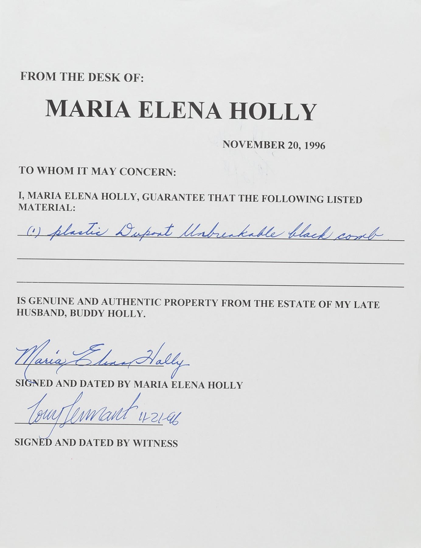 Buddy Holly's personally-owned "DuPont Unbreakable" black plastic comb, measuring 7.5? long. In fine condition, with expected signs of use. Accompanied by a letter of provenance from his wife, Maria Elena Holly, certifying that the "plastic Dupont Unbreakable black comb is genuine and authentic property from the estate of my late husband, Buddy Holly." A desirable piece of rock and roll history responsible for creating Holly's signature look: short, curly hair—a bit tousled on top—combined with his dark-rimmed glasses.