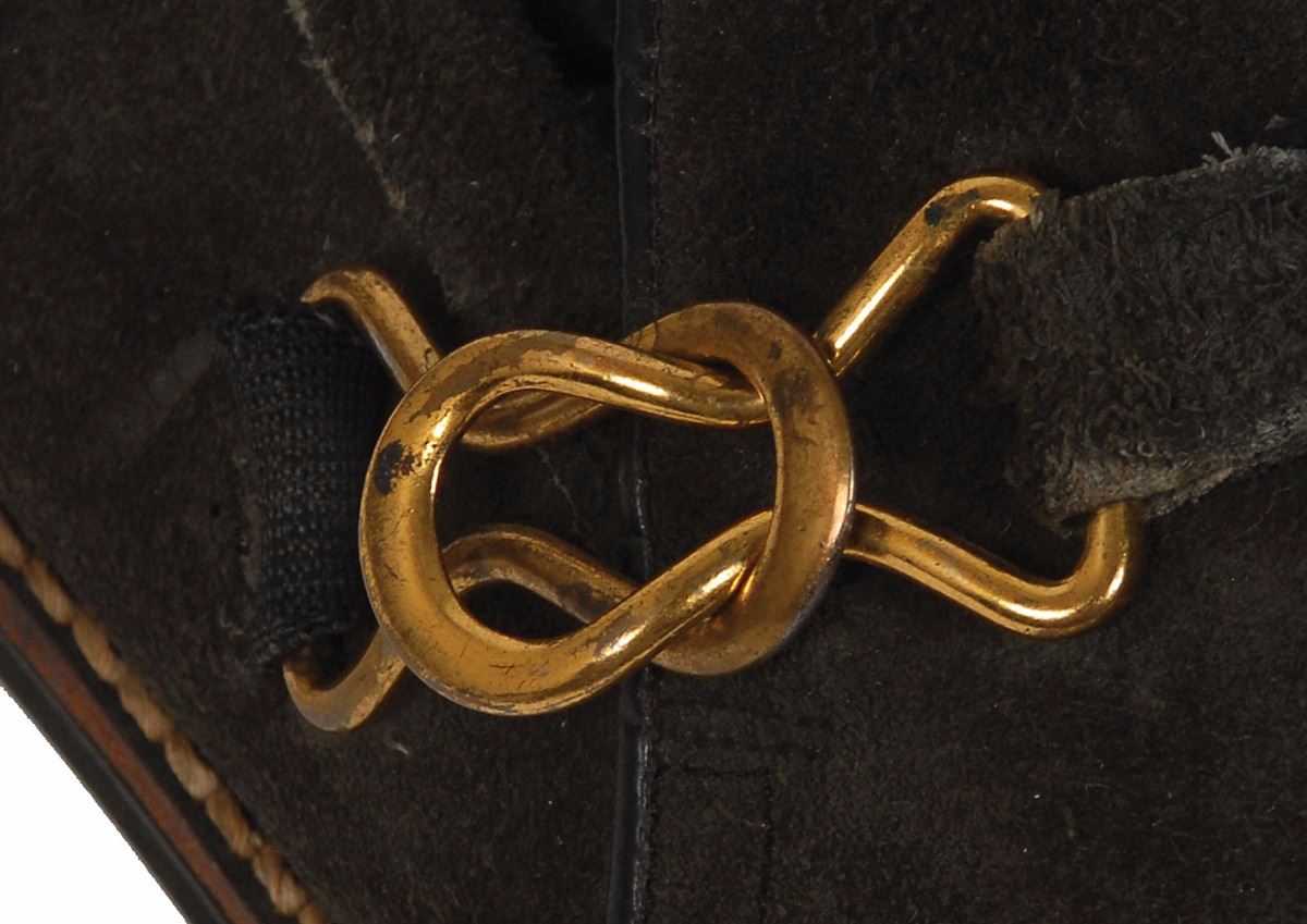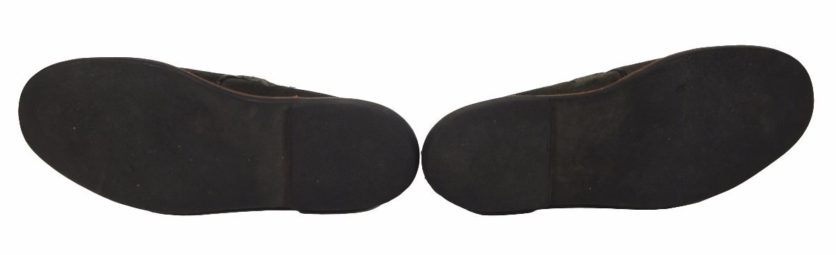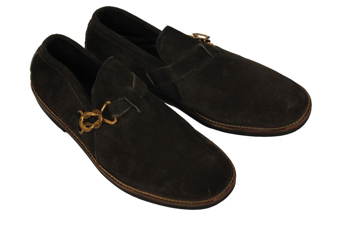 Buddy Holly’s personally-owned and -worn suede hunter green slip-on shoes by Thom McAn, size 9, featuring black rubber soles and brass side buckles. In very good condition, with expected wear from use.