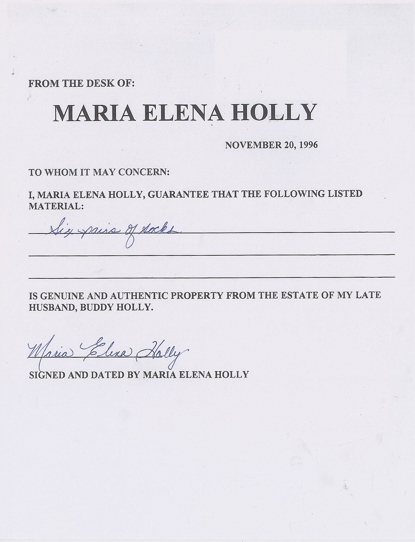 Buddy Holly's personally-owned charcoal/black mid-calf sock, measuring approximately 14? long. In fine condition, with expected signs of use, including a hole to back of heel. Accompanied by a letter of provenance from his wife, Maria Elena Holly, certifying that the sock "is genuine and authentic property from the estate of my late husband, Buddy Holly."