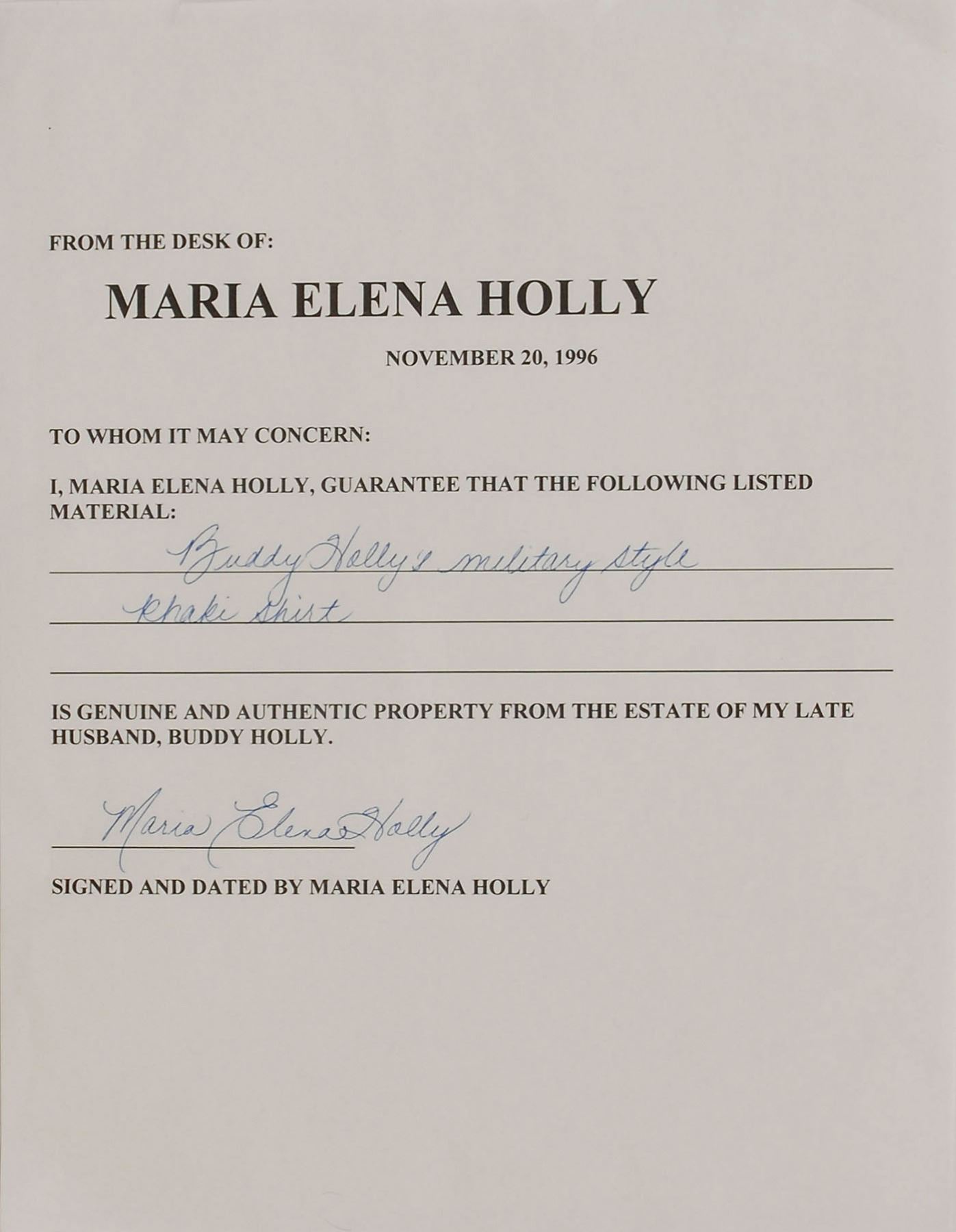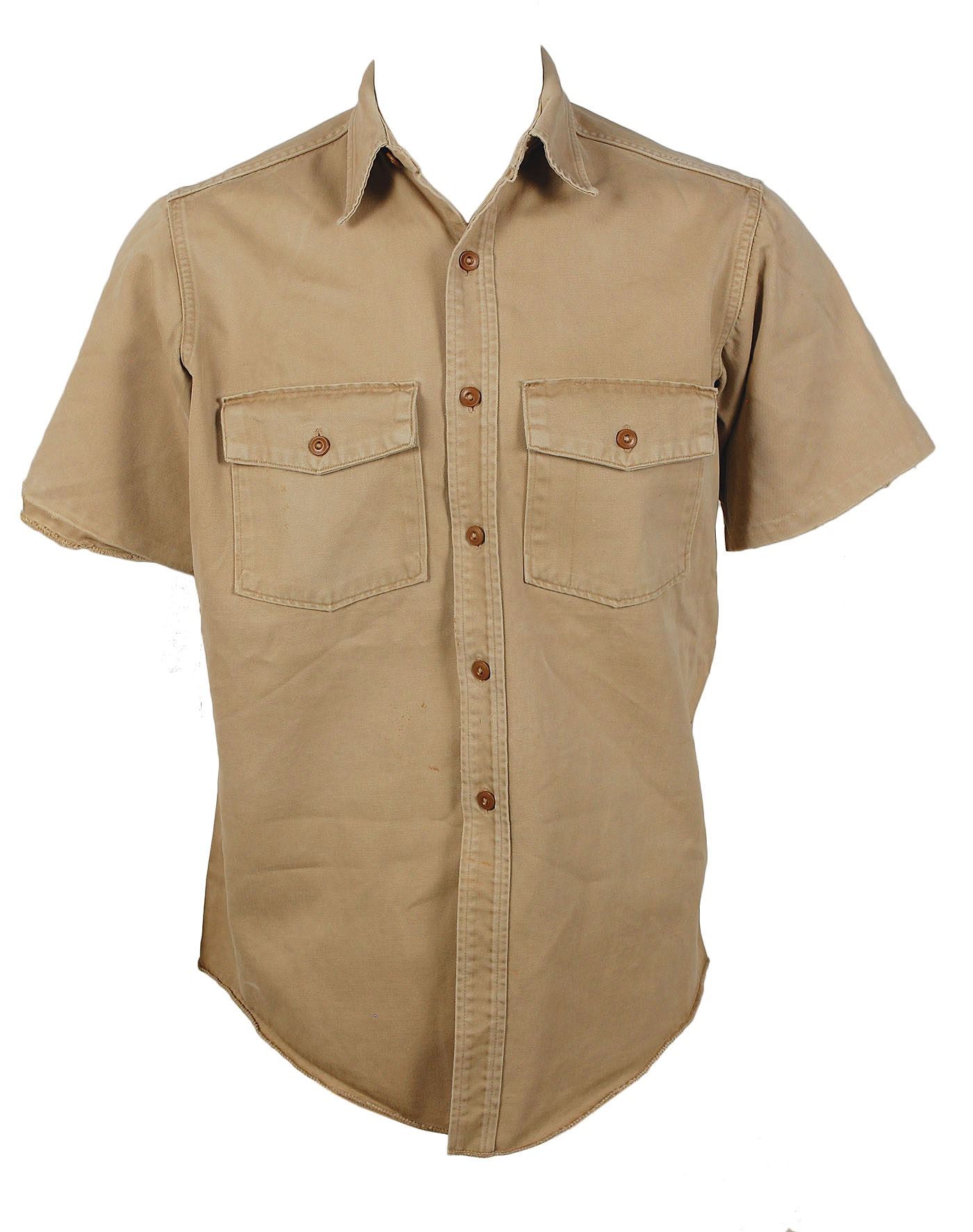 Buddy Holly's personally-owned and -worn beige Dickie's short-sleeve khaki work shirt, no size but likely large, used by Holly when he helped lay tile with the Holley Tile Company, the business owned by his older brother Larry. In very good to fine condition. Accompanied by a letter of provenance from Holly's wife, Maria Ellen Holly, dated November 20, 1996, in part: "I…guarantee that…Buddy Holly's military style khaki shirt is genuine and authentic property from the estate of my late husband."
