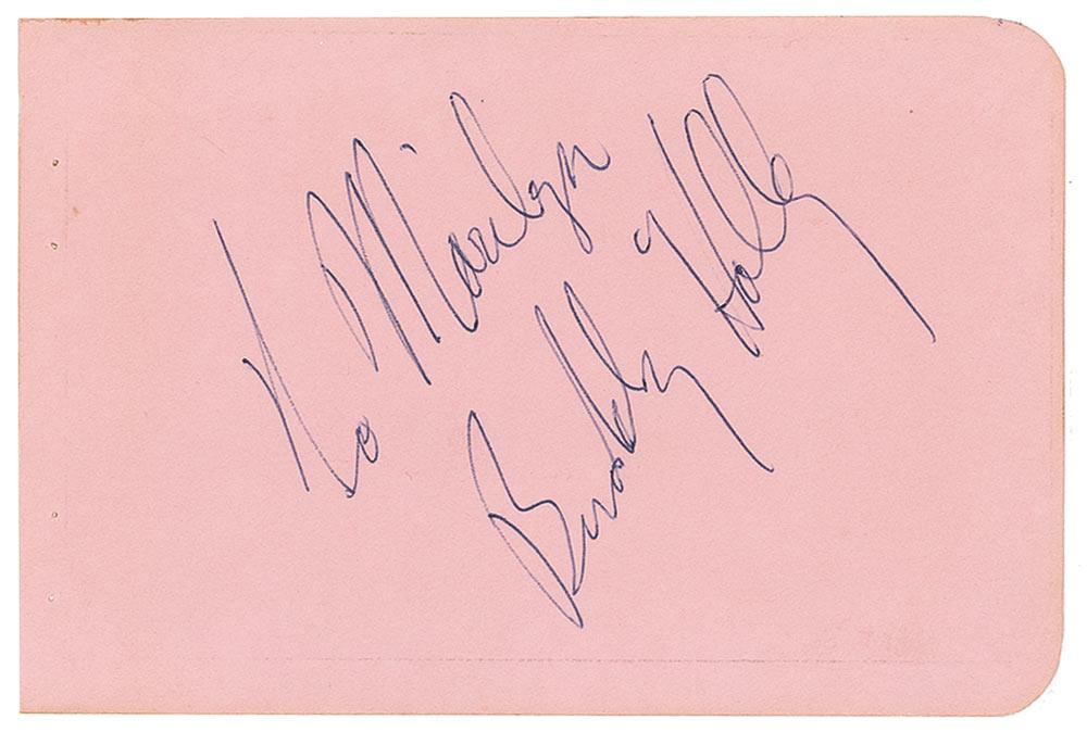 One of the earliest and biggest of the rock ‘n’ roll stars, Holly died tragically in a plane crash on February 3, 1959, en route to a concert. Vintage ballpoint signature and inscription, “To Marilyn, Buddy Holly,” on a light pink 6 x 4 album page. In fine condition, with some slight toning around edges. Accompanied by an unsigned postcard photo.