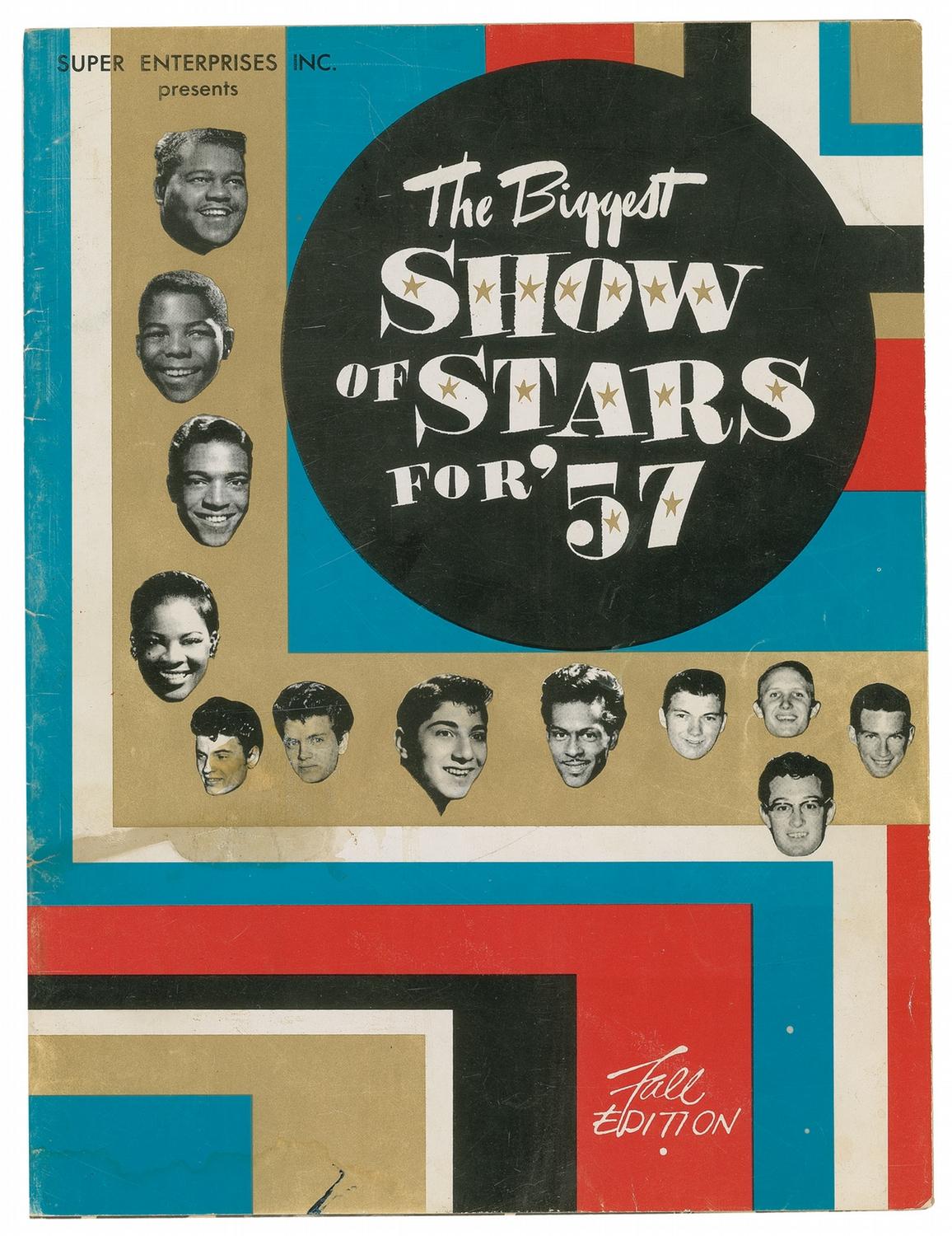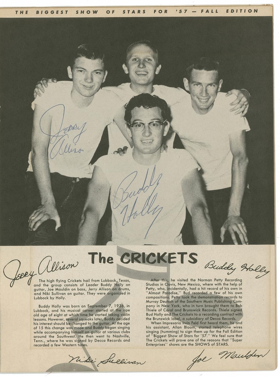 One of the earliest and biggest of the rock ‘n’ roll stars, Holly died tragically in a plane crash February 3, 1959, en route to a concert. Original vintage Biggest Show of Stars for ’57 rock and roll show program (Fall Edition), 9 x 12, signed inside in blue ballpoint on their full-page photo and biography by Buddy Holly and Jerry Allison. Program is also signed inside by Chuck Berry, all four members of the Drifters, with one inscribing to Lolita, Bobby Parker, and Clarence Ford. In fine condition, with some expected handling wear, creasing and soiling to covers, and a uniform mild shade of toning to some of the inside pages. Signed images of Holly in this size are scarce!