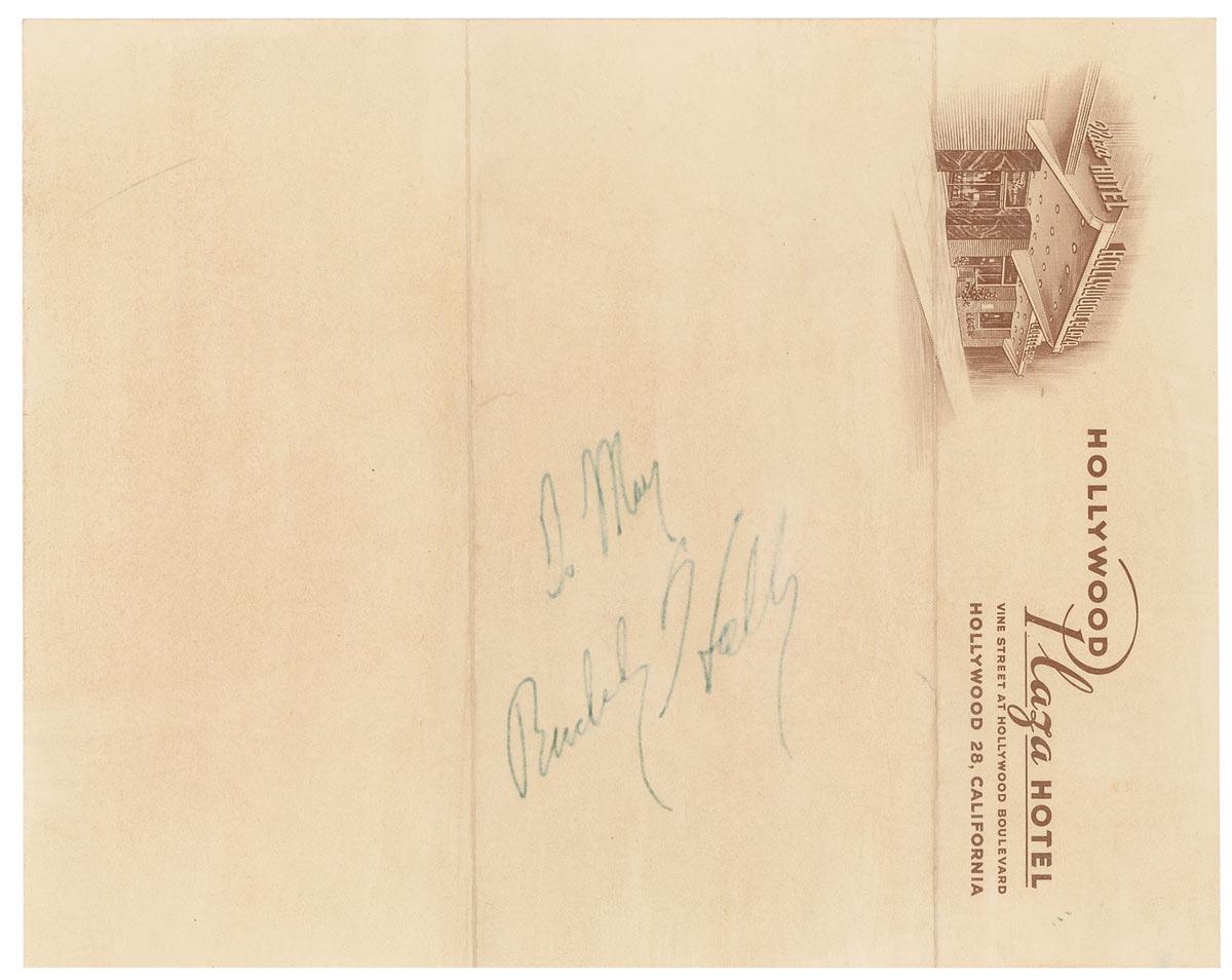 Ink signature and inscription, “To May, Buddy Holly,” signed vertically on a light tan 6 x 7.5 sheet of Hollywood Plaza Hotel stationery. The sheet appears to have been professionally cleaned. Two horizontal folds with a partial separation along the right side of the top fold, a few small creases, and the aforementioned cleaning, otherwise fine condition.