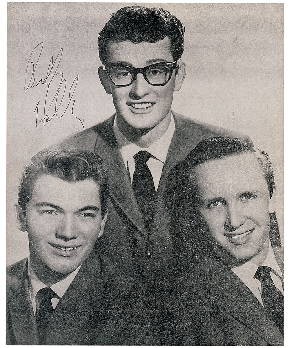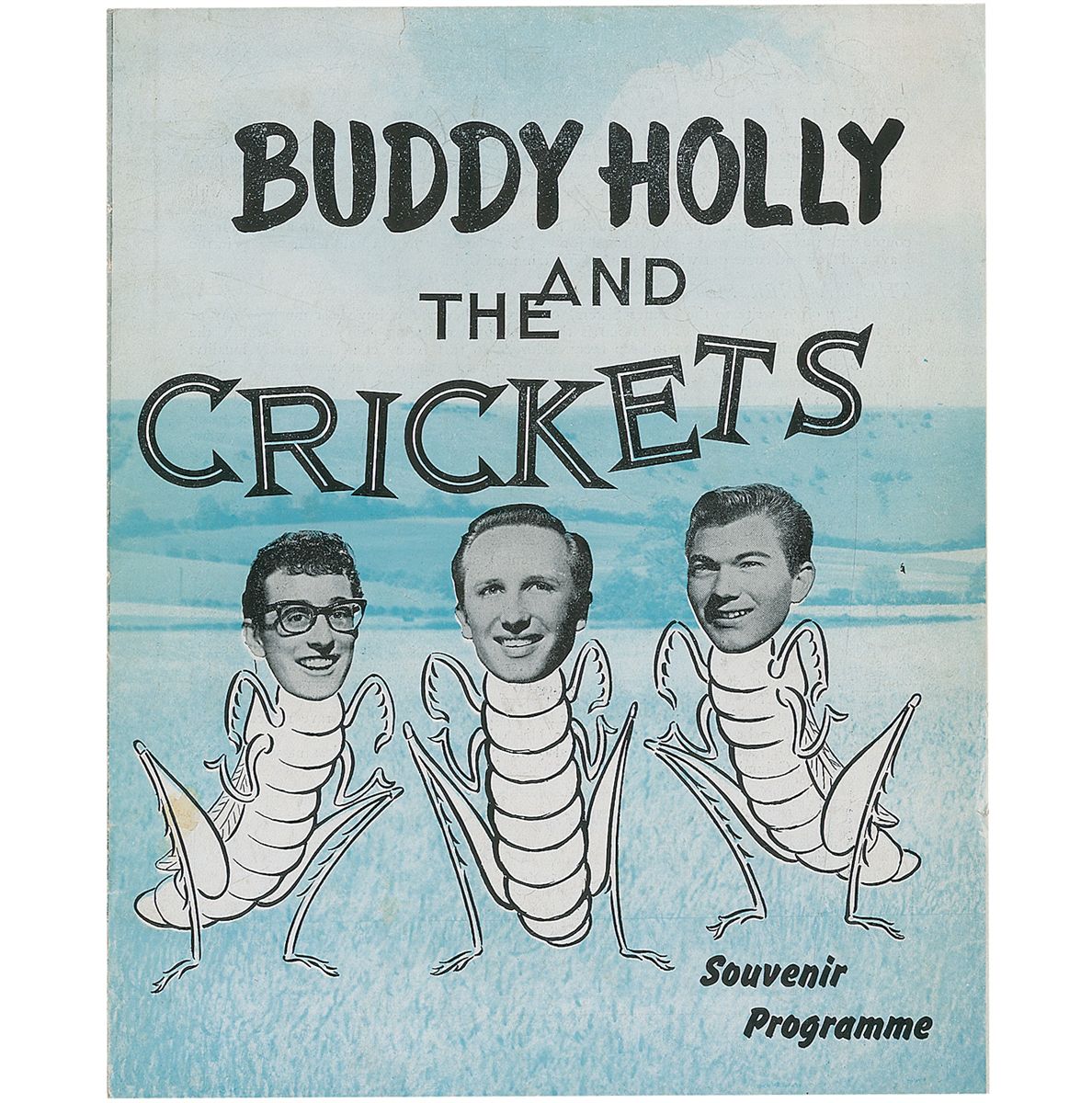 Original 1958 Buddy Holly and the Crickets U. K. tour concert program cover, front and back, 8.5 x 10.5, signed in black ballpoint on the back cover featuring a full-page image of Holly and his band. In very good condition, with edge tears, scattered creases and wrinkles, and several remnants of professionally removed signatures to the inside.