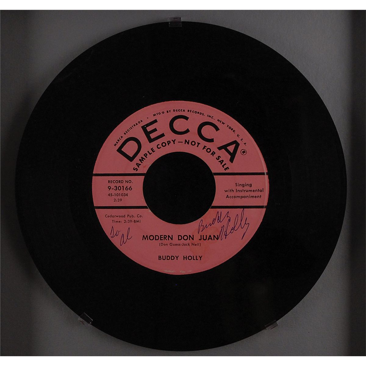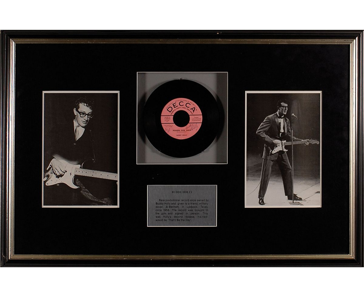 Rare Decca Records promotional 45 rpm single of Holly’s ‘Modern Don Juan’ single, marked on the label, “Sample Copy—Not For Sale,” and signed and inscribed on the label in blue ballpoint to his friend, Al Bennett, “To Al, Buddy Holly.” Holly presented the record to Bennett at a gym in Lubbock, Texas around 1956. Shadowboxed, matted and framed with two photos of Holly on stage and a descriptive plaque, to an overall size of 32 x 21. In fine condition, with a faint stain touching beginning of Holly’s first and last name, and a bit of trivial wear to label. Accompanied by a 1999 letter of provenance from Bennett which reads, in part: “I knew Buddy Holly back in the early fifties…I was in the Air Force at that piticular [sic] time stationed at Reese Air Force Base in Lubbock, Texas. I was on the Boxing team at that time I would train at a gym in Lubbock that’s were [sic] I first met Buddy Holly…we became good friends at the time, he was just getting started with his musical group, and he gave his first record that he recorded, and signed his name on the record for me.” Unsigned copies of this 45 are scarce and quite desirable, making a signed copy, with direct provenance, even more so.