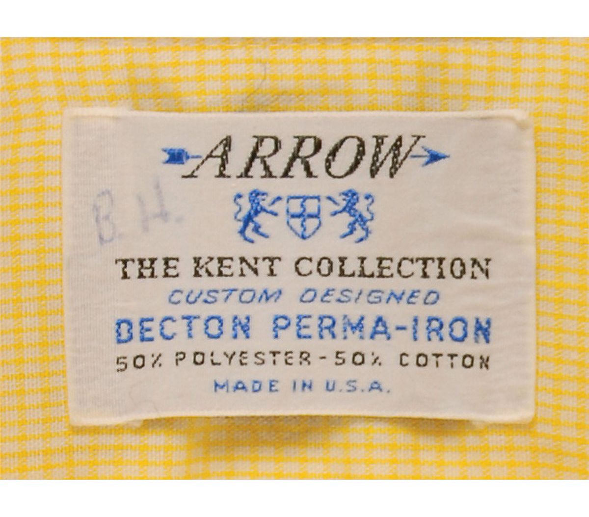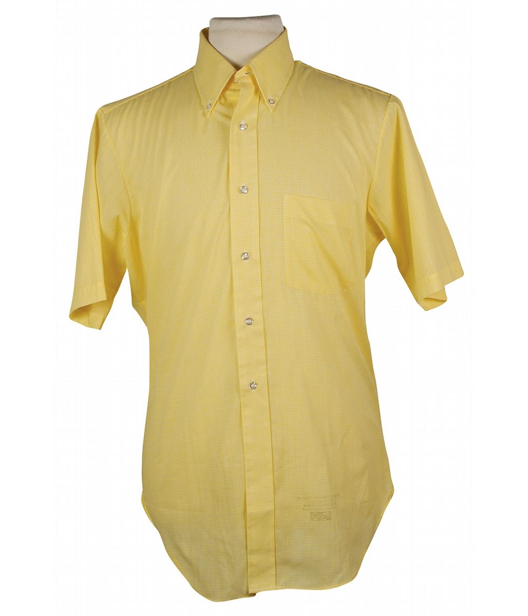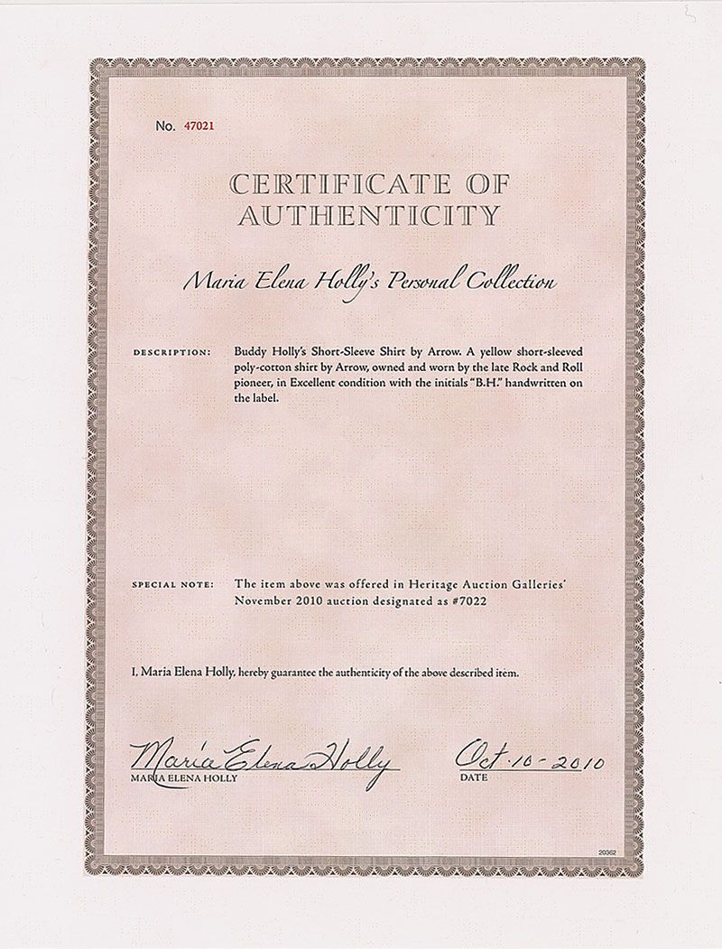 Holly’s personally owned and worn shirt. Yellow and white-checked Arrow Contour “Custom Designed” button-down short-sleeve shirt has a pocket over the left breast, “Dover BD #2,” stamped on to the collar, and initialled on the label “B. H.” In fine condition. Accompanied by a letter of provenance from Maria Elena Holly.