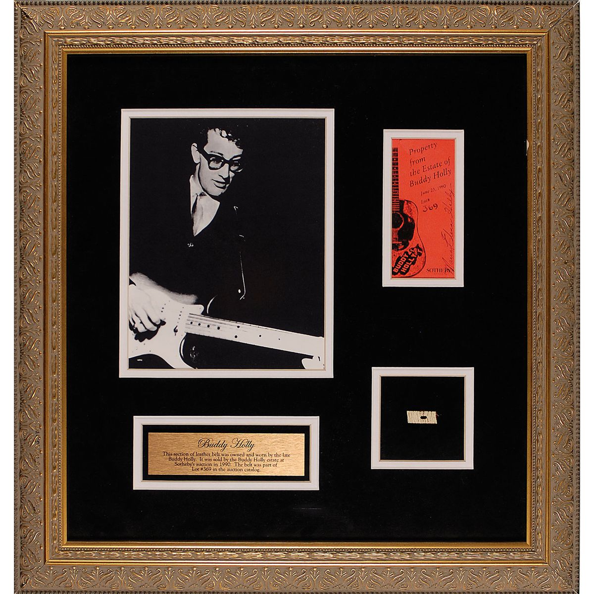 A small section, 1 x .25, of Buddy Holly’s white leather belt originally sold at the Buddy Holly Estate Auction at Sotheby’s. Double suede matted and framed with a photo of Holly and his guitar, a descriptive plaque and a color copy of the original signed certificate of authenticity from Sotheby’s, signed by Holly’s widow, Maria, to an overall size of 20.5 x 21.5. In fine condition. A well-preserved piece of memorabilia with exceptional provenance.