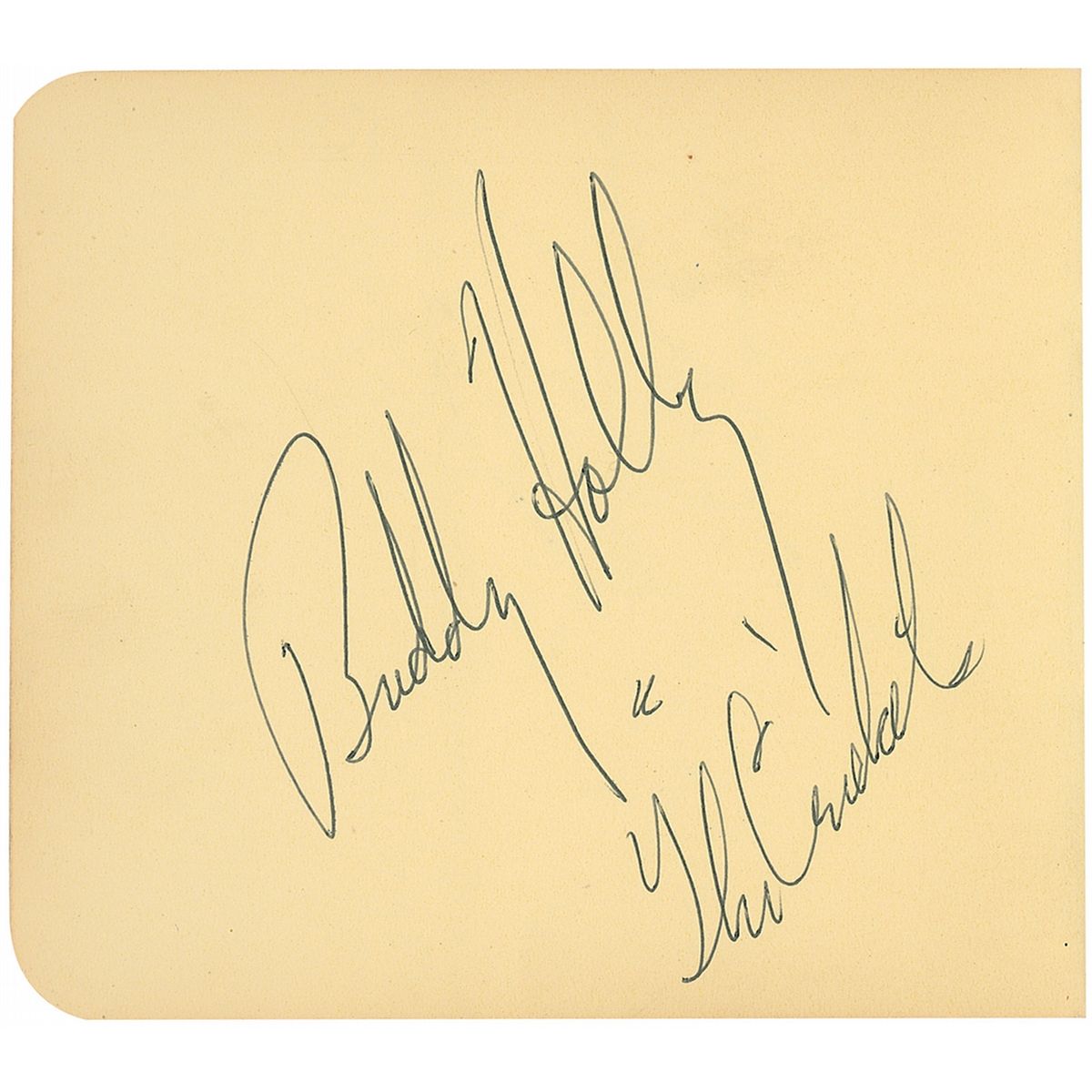 Vintage hardcover autograph album, 4.75 x 4, signed inside on a light yellow page in black ballpoint, “Buddy Holly, The Crickets.” Most pages signed on both sides, with other signatures dated 1956–57. Other signers include Cliff Richard, Alma Cogan, and Johnnie Ray. Holly page in very fine condition; overall album in very good condition, with heavy paper loss to spine and toned adhesive remnants to covers. Provenance: Bonham’s, 2011. The consignor notes that the signature was obtained on their 1958 UK tour. A rarity for Holly to inscribe with the band’s name as he did here, “The Crickets.”