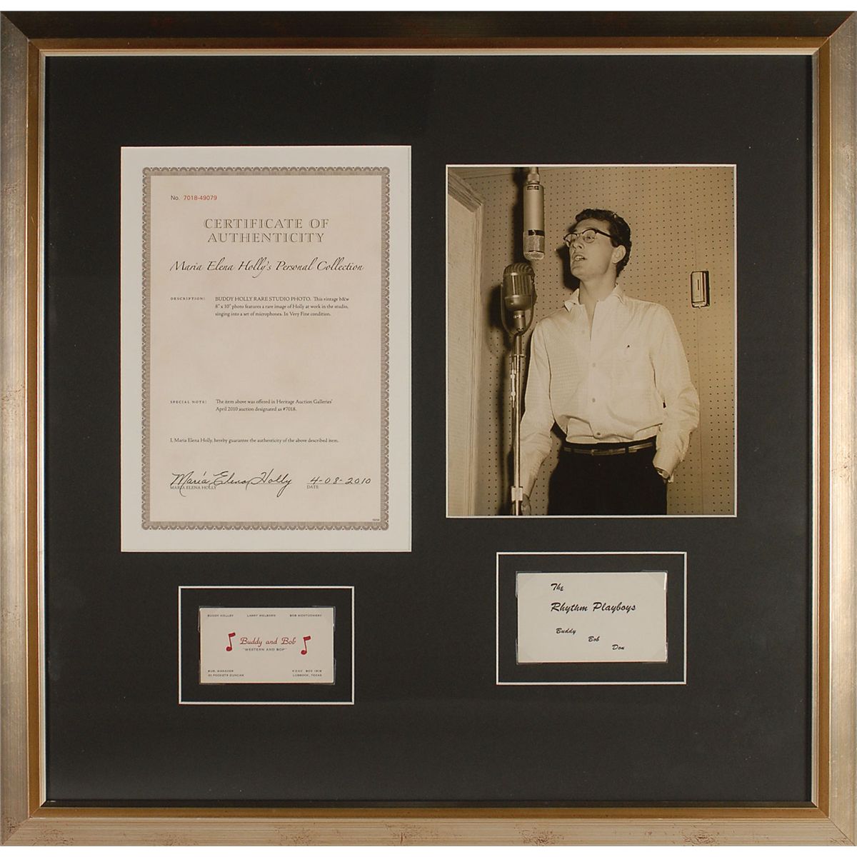 Two original business cards, one for “The Rhythm Playboys,” 3.75 x 2.25, listing Holly’s first name as well as the other two band members; one for “Buddy and Bob,” 3.5 x 2, with Holly’s full name printed along the top, along with the other two band members; and a vintage glossy 7.5 x 9 photo of Holly singing in the recording studio. All three are matted and framed together with a letter of provenance from Maria Elena Holly for the photo to an overall size of 22.5 x 22. In fine condition. Accompanied by a letter to provenance from Holly’s brother Larry for the Rhythm Playboys card.