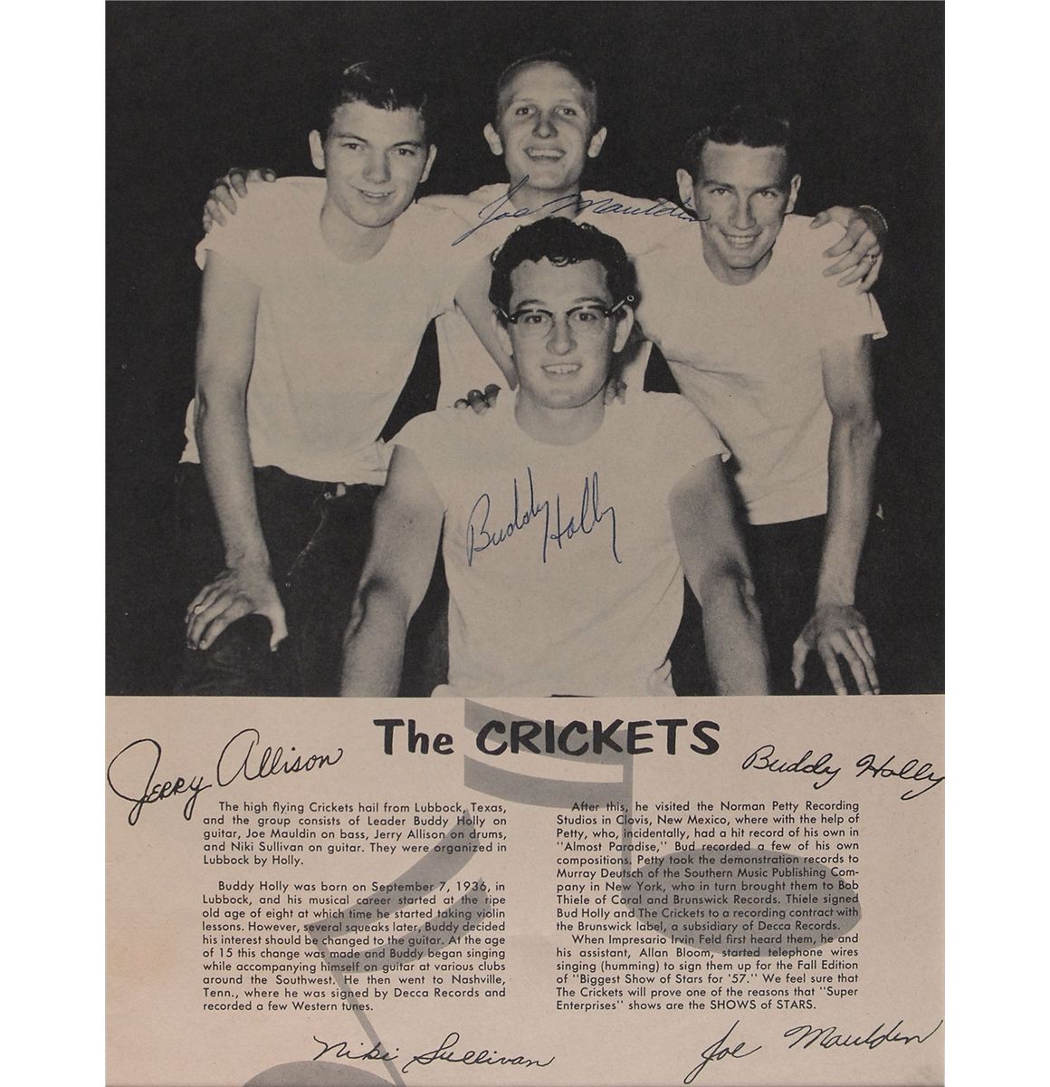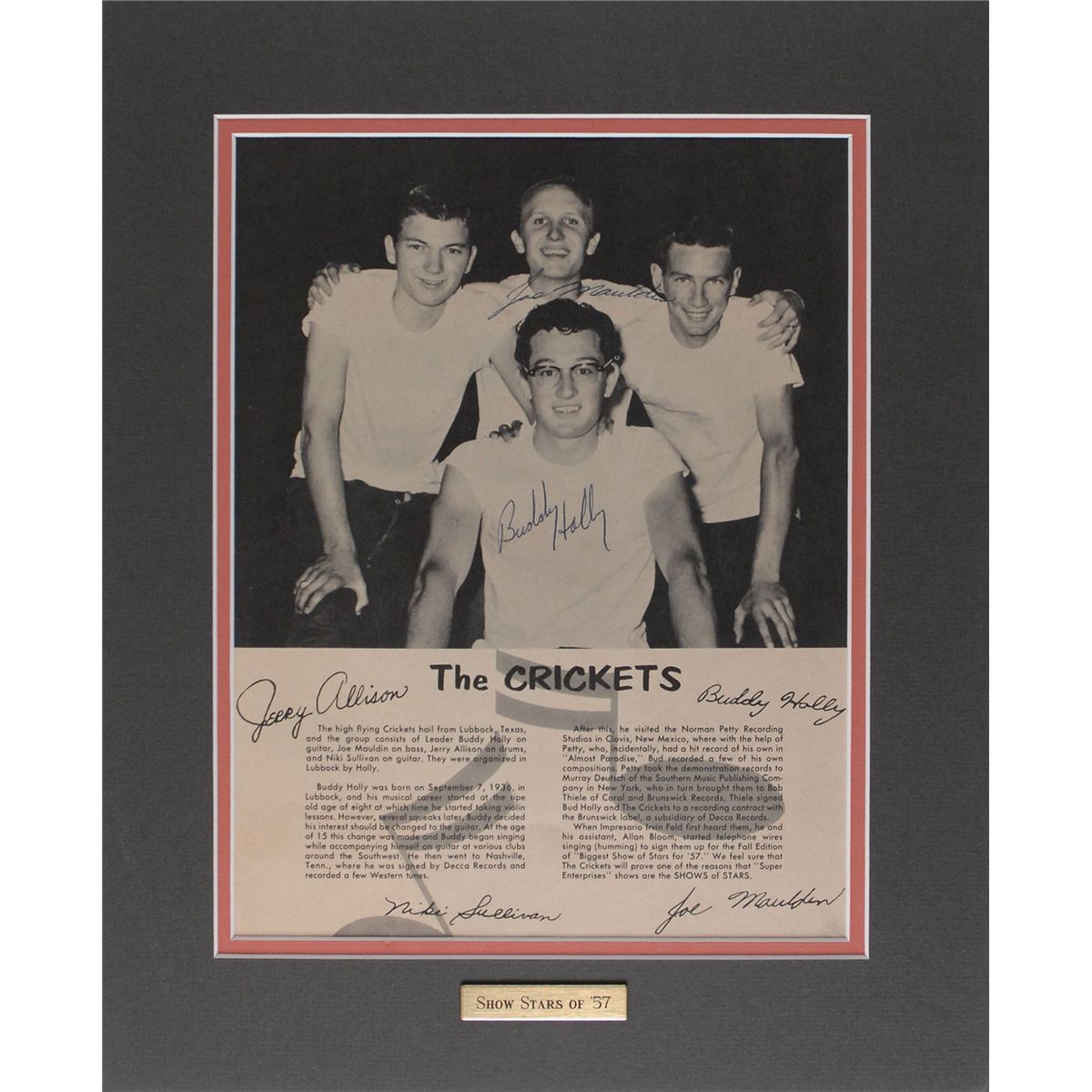 Vintage page from the ‘Biggest Show of Stars for ’57’ rock and roll show program, 8.75 x 11.25, featuring an image of The Crickets and a biography of the band, nicely signed in blue ballpoint by Buddy Holly and Joe Mauldin. Double-matted with a small plaque to an overall size of 12.75 x 15.75. In fine condition. Accompanied by a full letter of authenticity from Roger Epperson/REAL. Signed images of Holly, particularly in this larger size, are quite scarce.