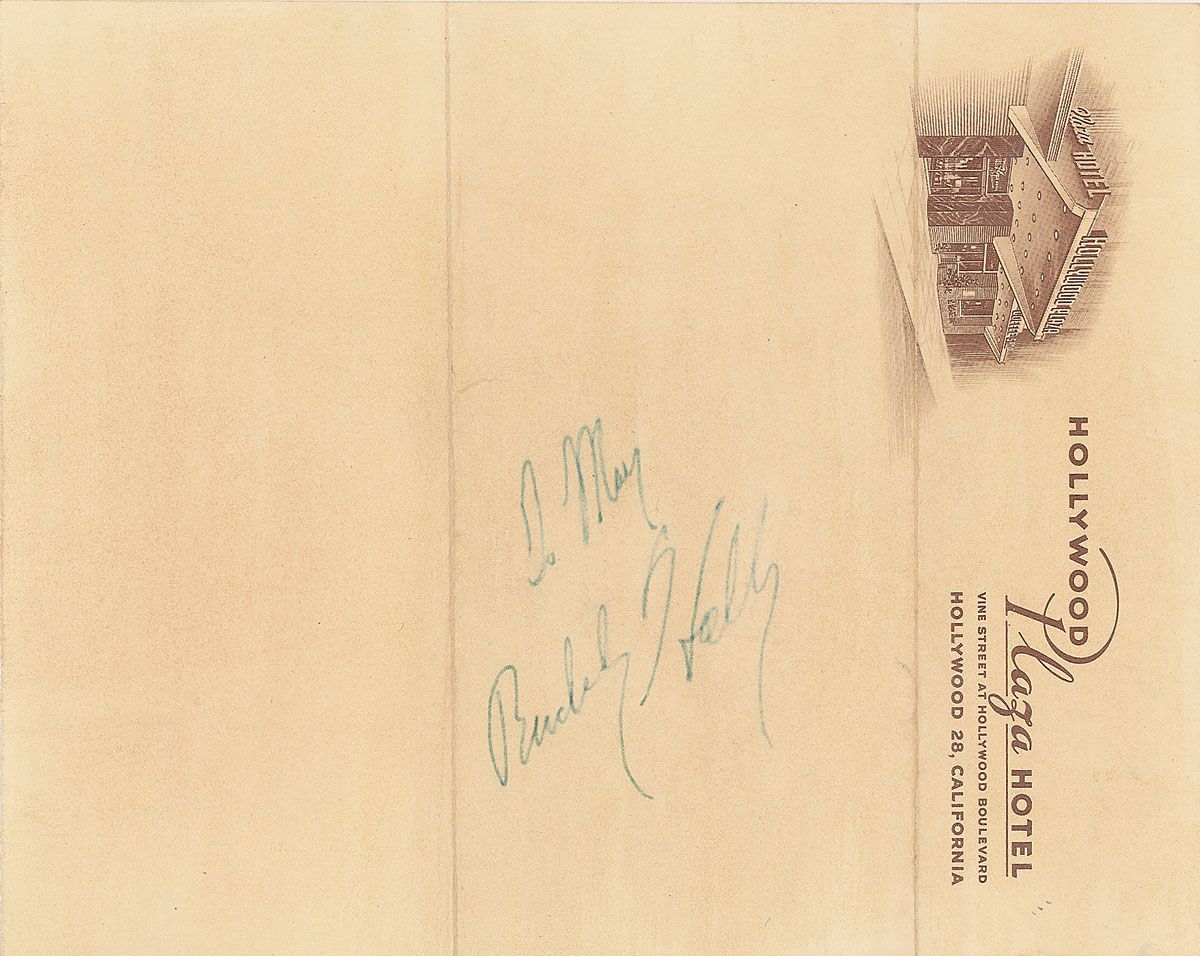 Vintage ink signature and inscription, “To May, Buddy Holly,” signed vertically on a light tan 6 x 7.5 sheet of Hollywood Plaza Hotel stationery. The sheet appears to have been professionally cleaned. Two horizontal folds with a partial separation along the right side of the top fold, a few small creases, and the aforementioned cleaning, otherwise fine condition.