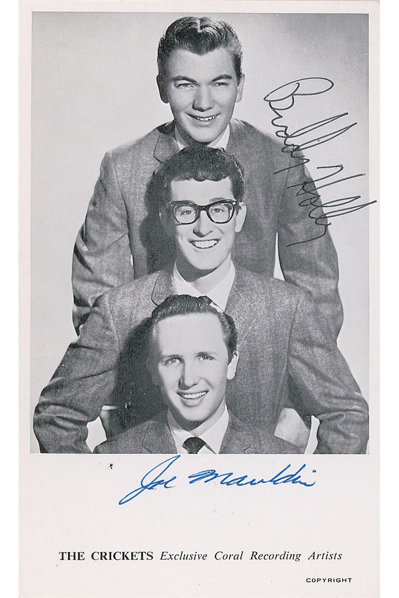Scarce vintage 3.5 x 5.75 Coral Records promotional postcard photo of The Crickets, signed in black ballpoint by Buddy Holly and in blue ballpoint by Joe Mauldin. A few light bends and creases and some light rubbing to finish, otherwise fine condition.