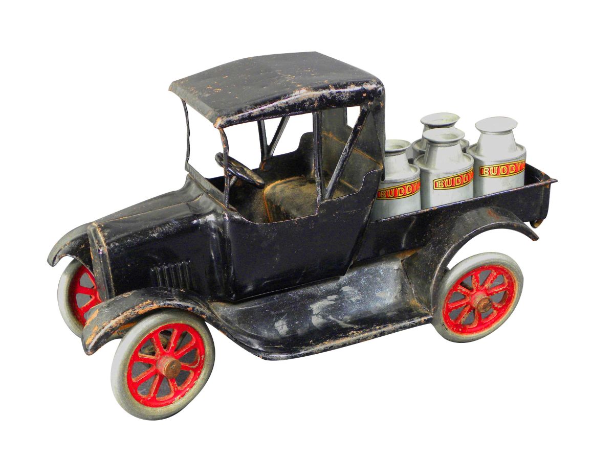 Buddy L (Flivver) Pick up Pressed Steel Truck. Original Buddy L sticker on bottom. Comes with four milk cans. Fair played with condition. 12 inches long.