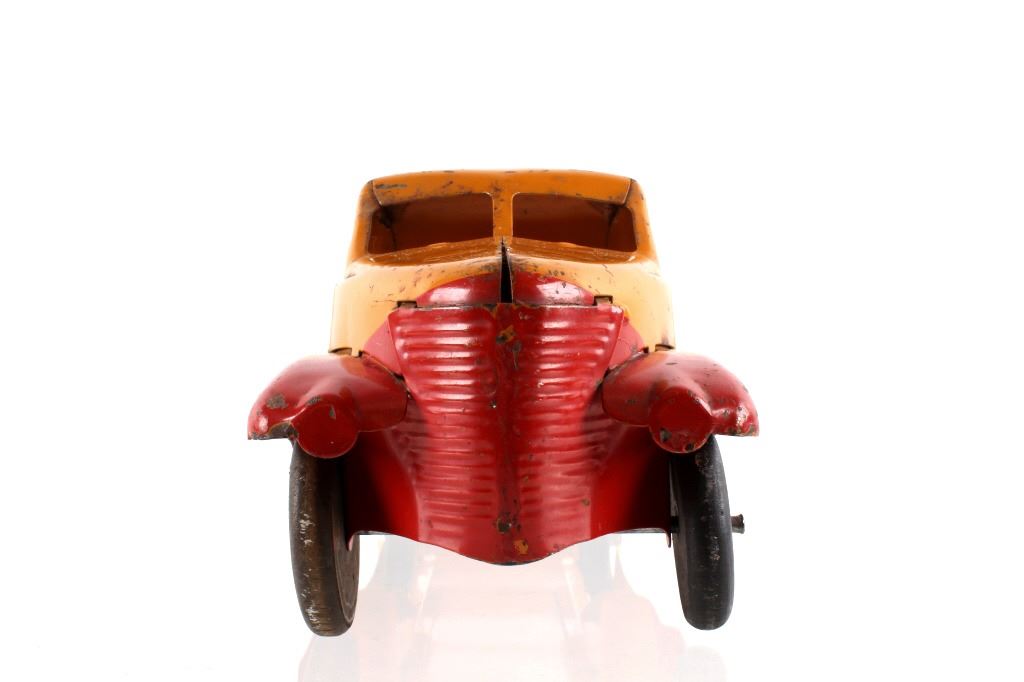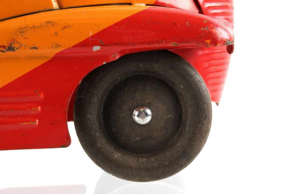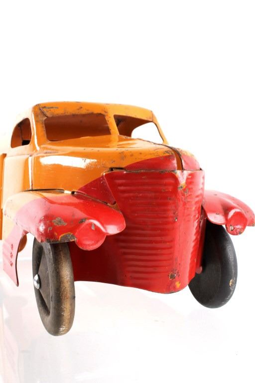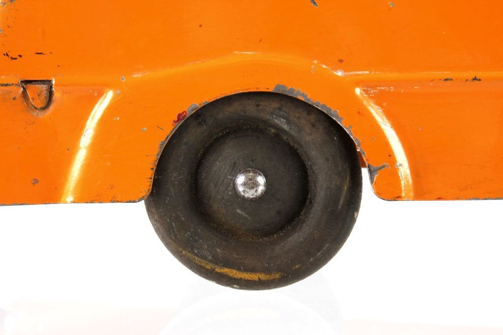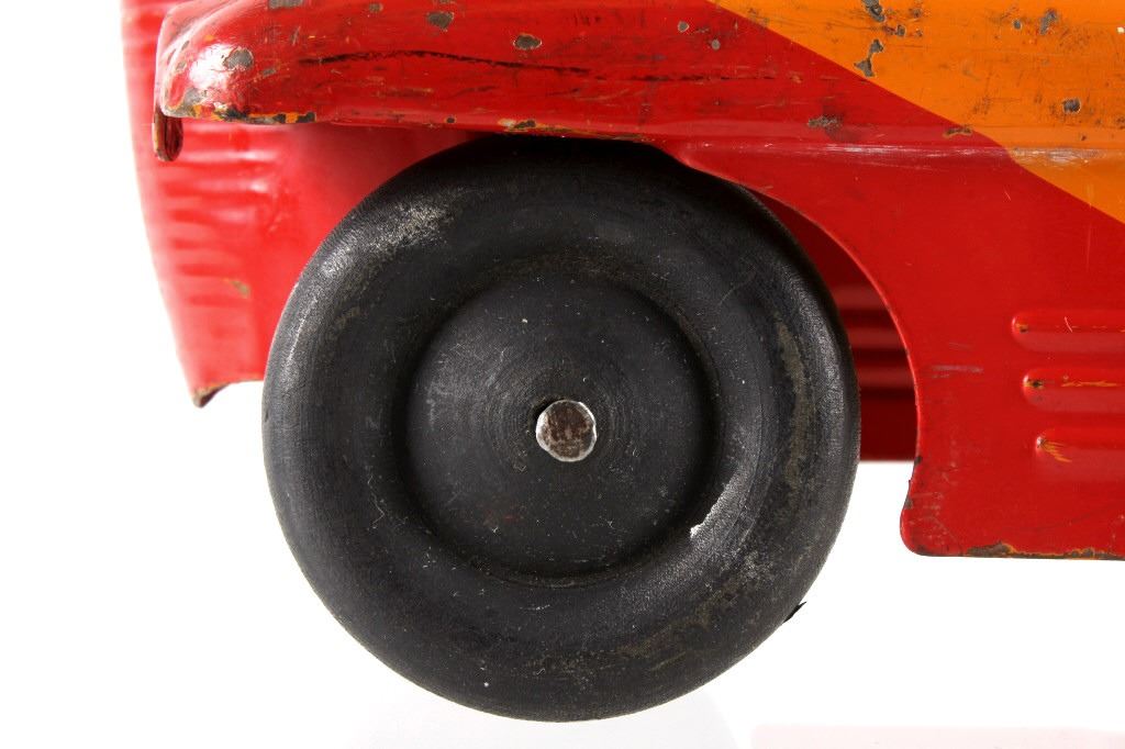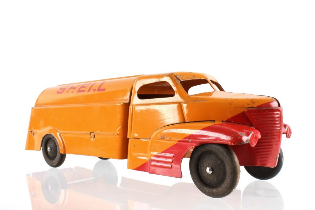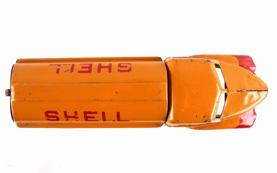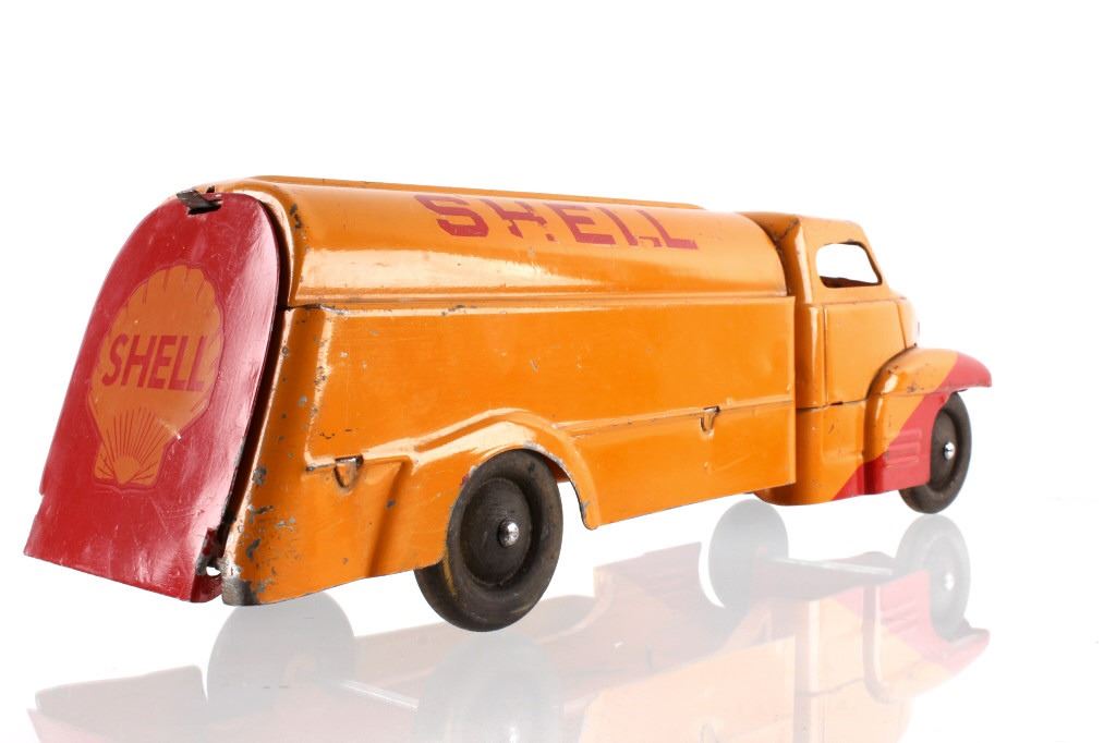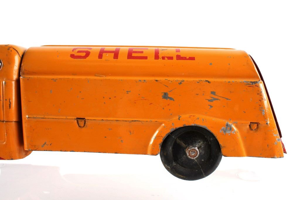 For your consideration is this Buddy L International Shell oil truck toy circa 1938. This is a really nice highly collectable Buddy L truck with orange paint job with a single red stripe along the front of the truck and showing an opening in the back that works as intended. The condition of this truck is good showing original paint and original wooden tires with the decal showing some wear but all original. The measurements of this toy truck are 5 1/4" x 17" x 5".