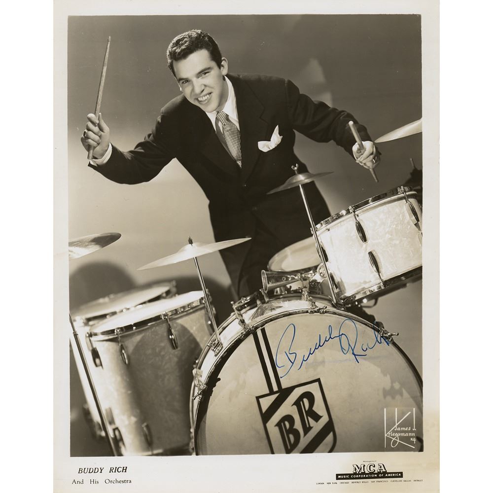 Vintage glossy 8 x 10 MCA publicity photo of Buddy Rich posing behind his drum set by James J. Kriegsmann, nicely signed in fountain pen. In fine condition.