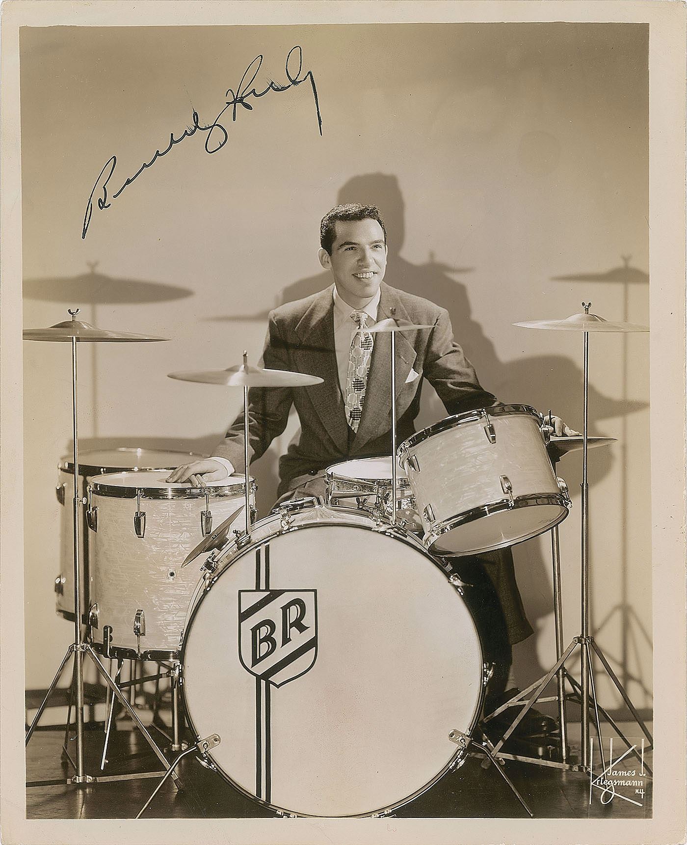 Vintage glossy 8.25 x 10 James J. Kriegmann portrait of Buddy Rich seated behind his personalized drum kit, signed in bold black ink. In fine condition, with scattered light creasing.