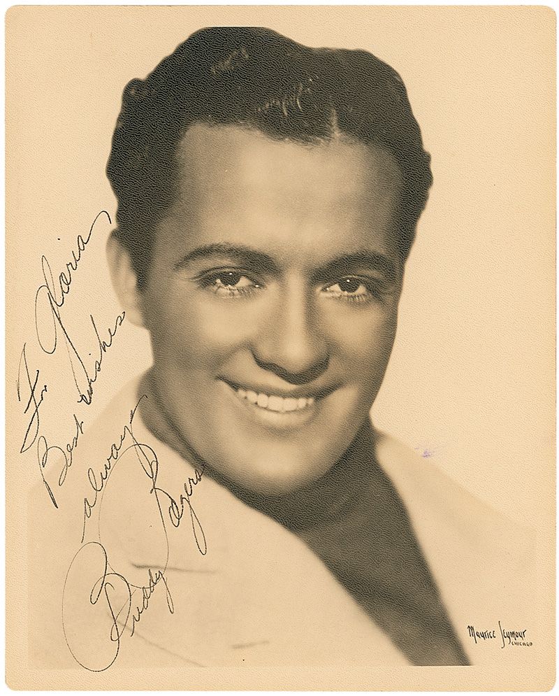 Handsome vintage matte-finish 8 x 10 photo, signed and inscribed in fountain pen “For Gloria, Best wishes always, Buddy Rogers.” In fine condition, with a bit of scattered light soiling.