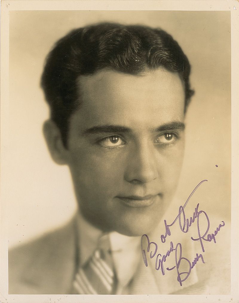 Glossy 8 x 10 Paramount Pictures publicity photo, signed and inscribed in black felt tip “Bob—Good luck, Buddy Rogers.” In very good condition, with numerous scattered tack holes to borders, surface marks, and light creases.