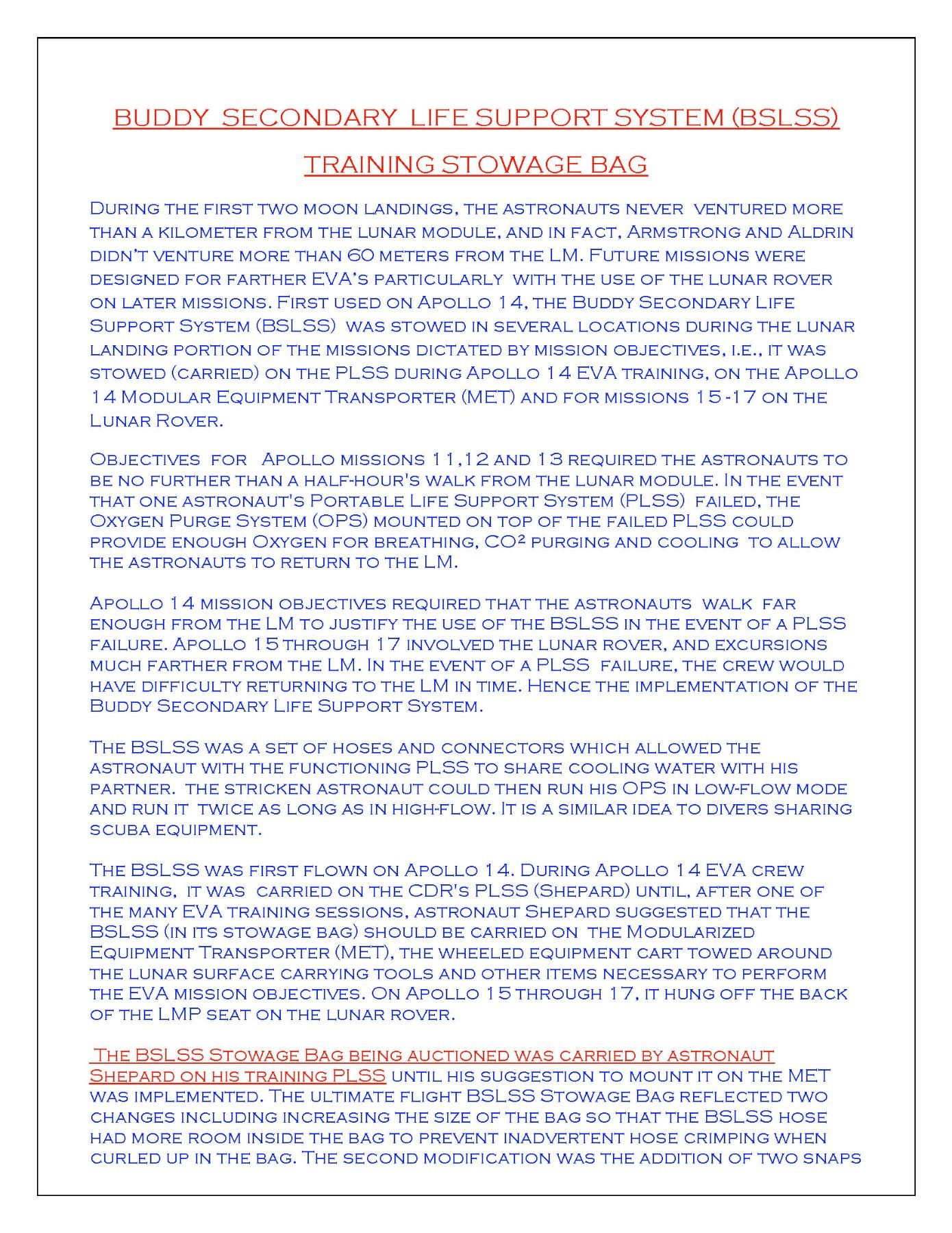 Beta cloth Buddy Secondary Life Support System (BSLSS) stowage bag personally used by Commander Alan Shepard during training for the Apollo 14 mission. The bag measures 15 x 11.5 and has a side flap cover with snap closure, as well as an upper strap, 33.5˝ in length, with looped locking hardware at each end. In fine condition. First used on Apollo 14, the Buddy Secondary Life Support System (BSLSS) was a set of hoses and connectors designed in the case of a failed Portable Life Support System (PLSS) during an extended lunar EVA, which ultimately enabled the astronaut with the functioning PLSS to share cooling water with his partner. In the event that an astronaut's PLSS failed, the Oxygen Purge System (OPS) mounted on top of the failed PLSS could provide enough oxygen for breathing, as well as the required CO2 purging and cooling to allow the astronauts’ return to the LM. The BSLSS was carried on the PLSS during Apollo 14 EVA training, on the Apollo 14 Modular Equipment Transporter (MET), and on the Lunar Rover for missions 15–17.