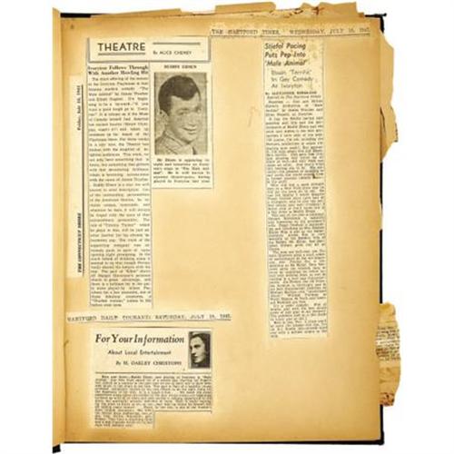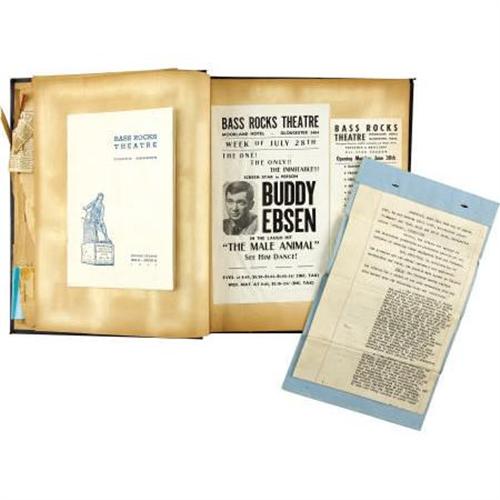 <B>Buddy and Vilma Ebsen Scrapbook and Unsigned Contract.</B></I> Long before Hollywood beckoned, Buddy Ebsen and his younger sister Vilma were a famed singing and dancing musical comedy team, headlining such Broadway hits as <I>Flying Colors</B></I> (1932) and <I>The Ziegfeld Follies of 1934.</B></I> This handsome, leather-bound 12"x 14" scrapbook contains newspaper and press clippings on Buddy and Vilma, as well as an August 20, 1930, four-page unsigned contract between the Ebsens and producer Benny Davis. The many clippings cover Broadway, the 1939 New York World's Fair, summer stock -- a fascinating time machine back to a bygone show business era from a man who experienced it all. In Fine to Very Fine condition. <I>From the Buddy Ebsen Estate.</B></I><BR><BR><b>Shipping:</b> Books & Catalogs (<a target="_blank" href="http://www.heritageauctions.com/common/shipping.php">view shipping information</a>)