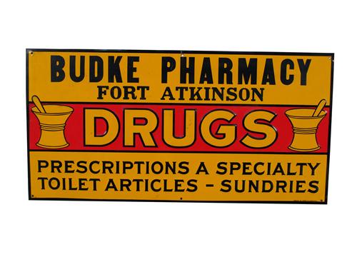 Budke Pharmacy Drugs   tin embossed sign  12 x 23 "  excellent condition