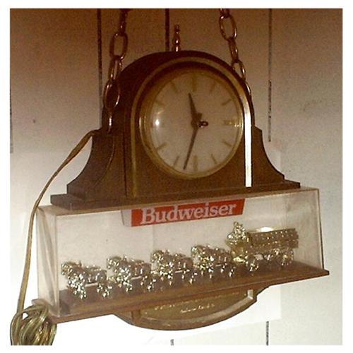 Budweiser Bar Clock & Light. In good condition and in working order. Yes, the clock shows the time, the red Budweiser light under the clock lights up. Just hang it up, plug it into an electric outlet, and you are all ready to advertise the champion of beer.<p>Measurements are: 16" tall, by 17" long, and 4" wide. With hanging chain - 34" tall total length.<p>Made of plastic and plexiglass.<p>Colors are brown with gold trim.<p>Roman numerials on face of clock.<p>8 horse Clydesdale team hitched to a 4 wheel wagon. Two men and a dog sitting on top of the wagon. On the side of the wagon is the Anheuser-Bush trademark - eagle symbol, the cities - Tampa, Fla.; St. Louis, MO; Newark N.J.; Los Angeles, Calif. On the bottom is an engraved tag "World Champion Clydesdale Team, Anheuser-Bush, Inc." On the back of the clock is a large 3-D Anheuser-Bush trademark - eagle symbol.<p>Add the king of beer, Budweiser, clock & light to your collection. For home or business. Hang it over a bar, put it in a TV or pool room. What a great conversation piece.