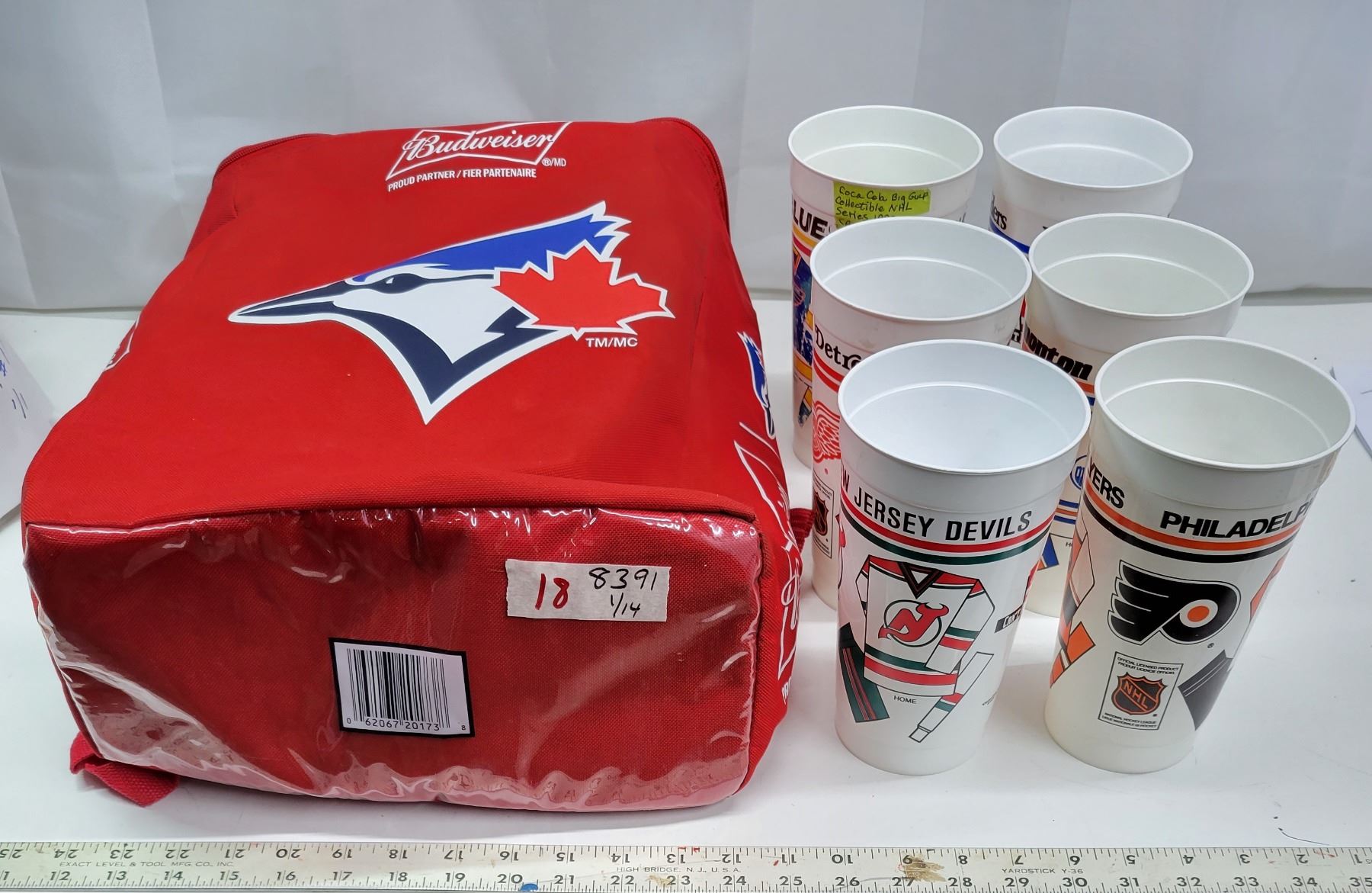 Budweiser Blue Jay Cooler Back Pack and 6 Coke Collector Big Gulp Glasses