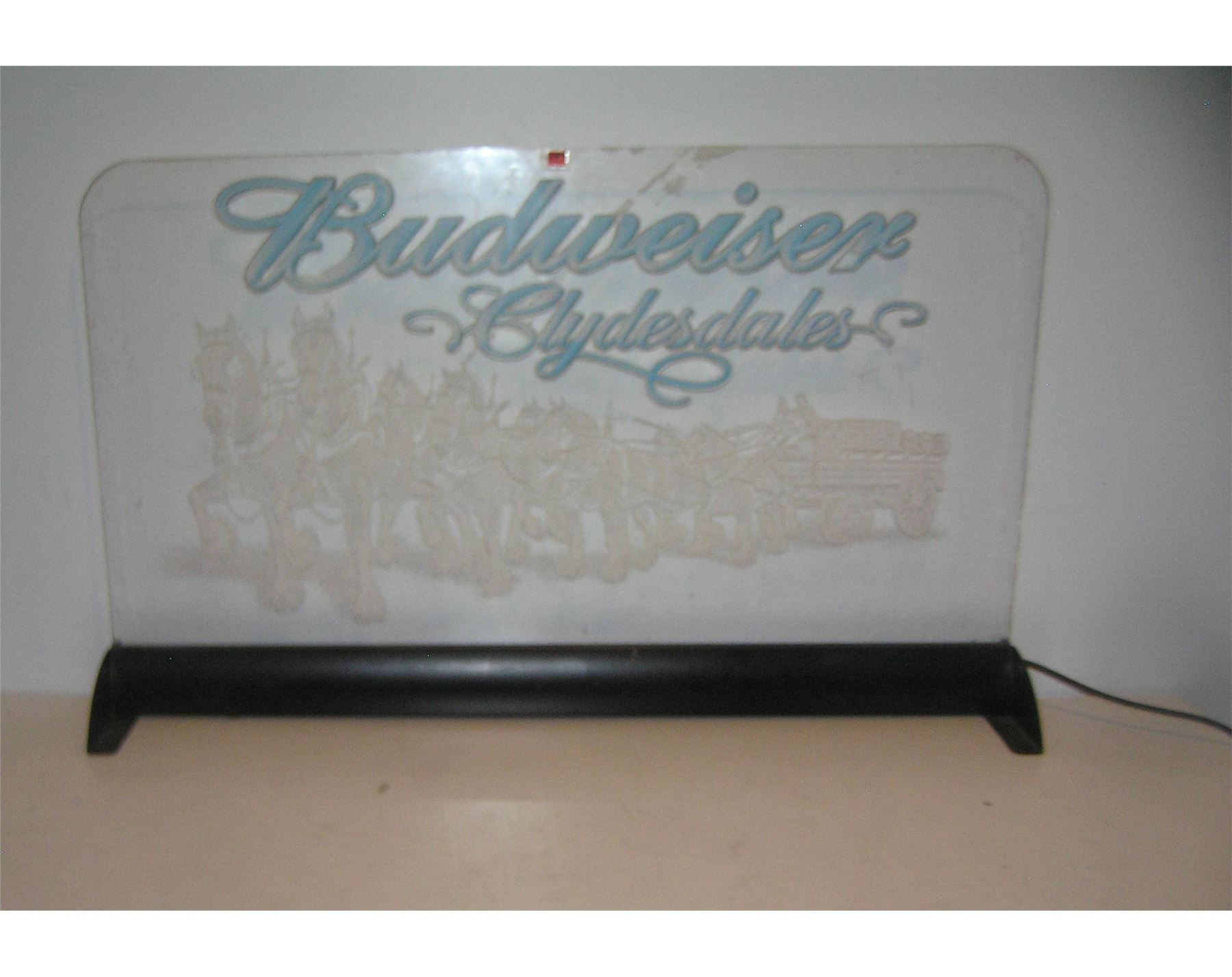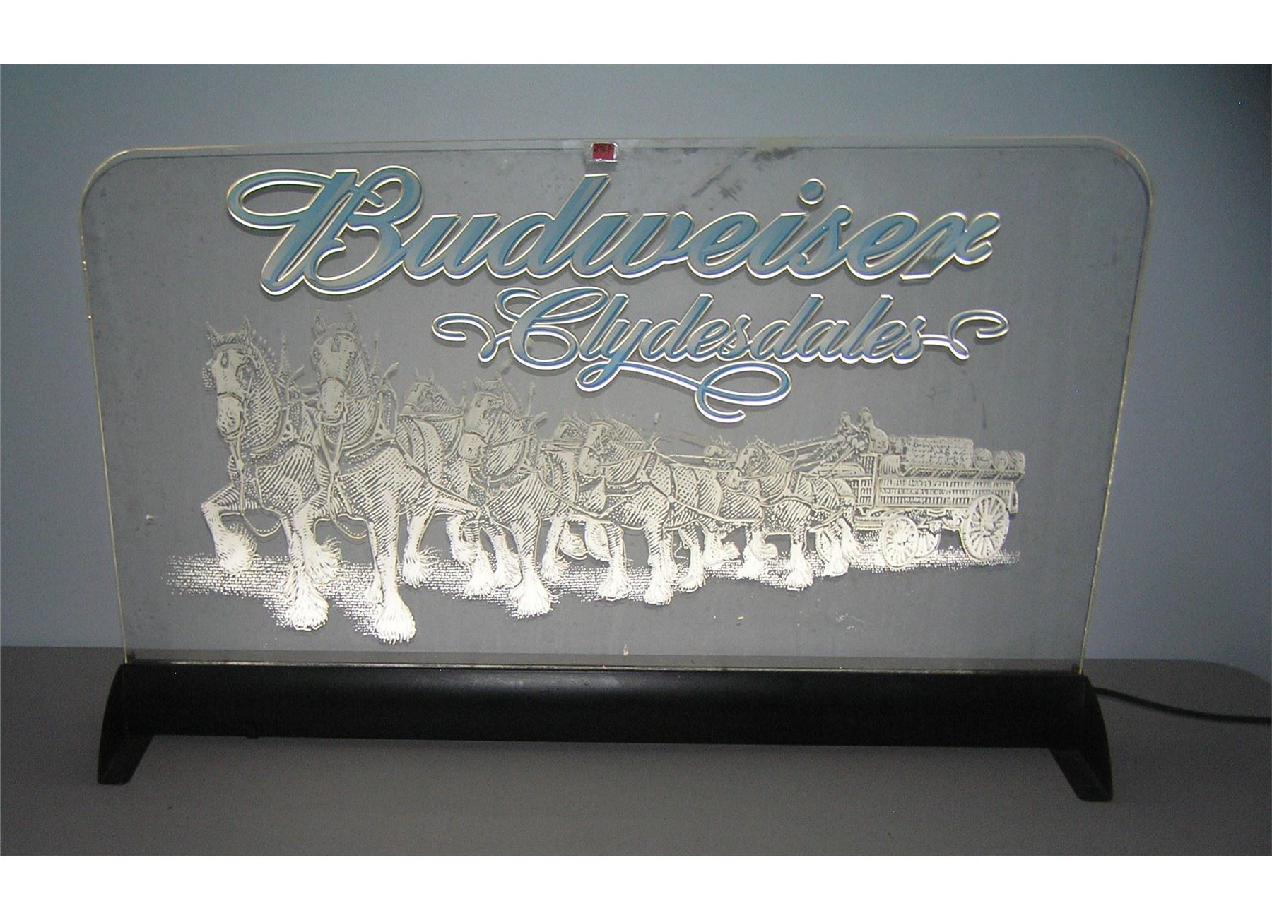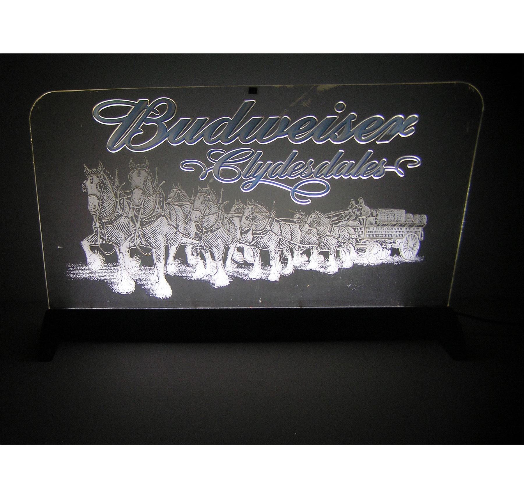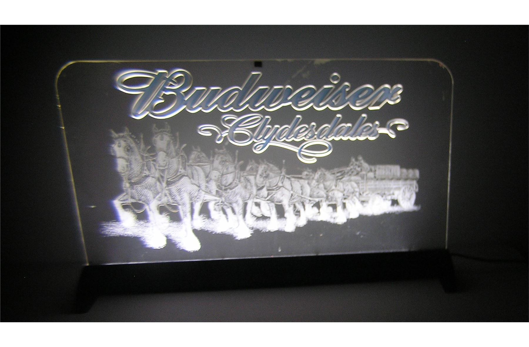 Great vintage Budweiser Clysdale and beer wagon illuminated advertising beer sign great etched Lucite with metal frame est. value $300.00-$350.00