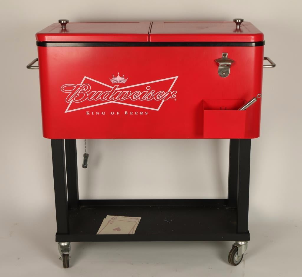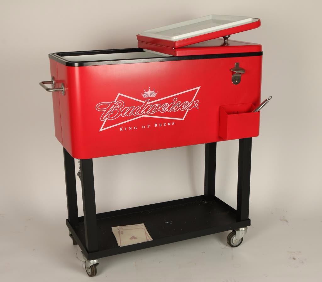 All red cooler with Budweiser logo. Two part lift open lid on wheels with lower shelf. Front has a bottle opener and comes with stainless steel ice scoop. Measures 24 1/2"h x 30 1/2"w x 15 1/2"d. Perfect for poolside or patio party.