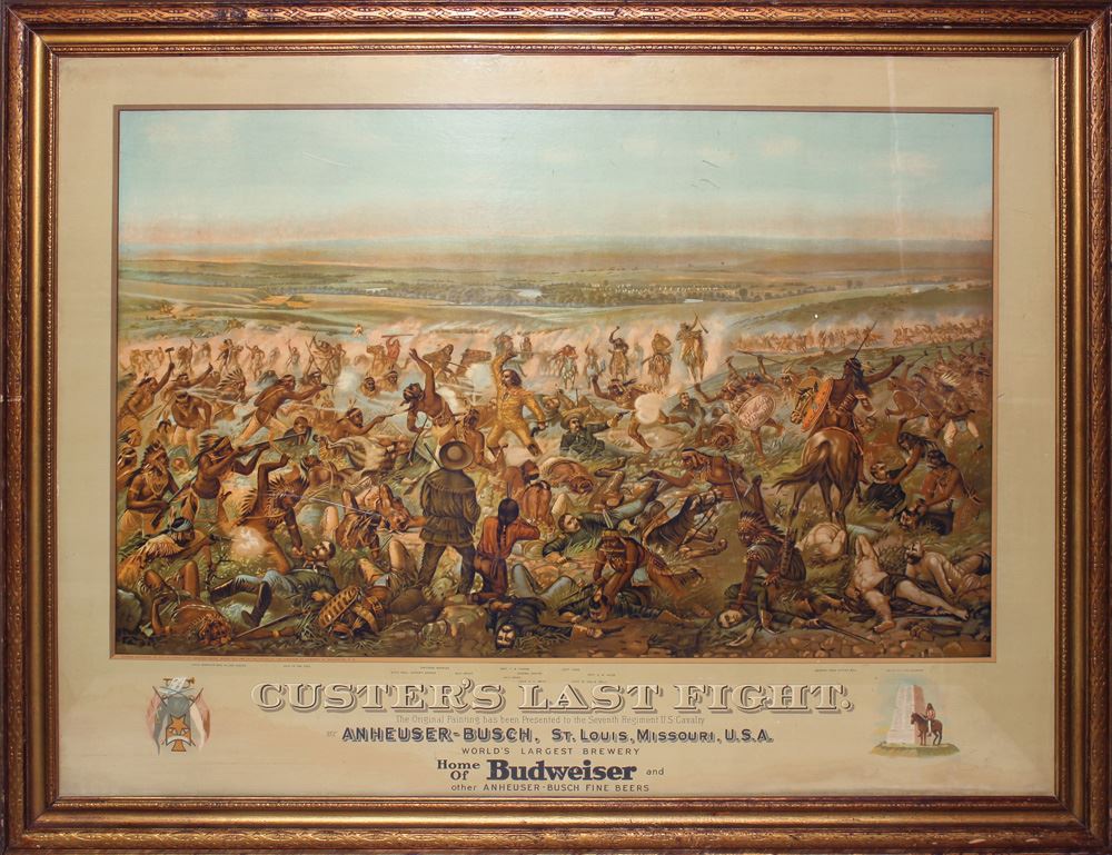 This attractive large 1950's image of "Custer's Last Stand" was issued by and advertises Budweiser beer. With crisp colors and great appeal. Framed in nice period frame, image measures 36"X 47".