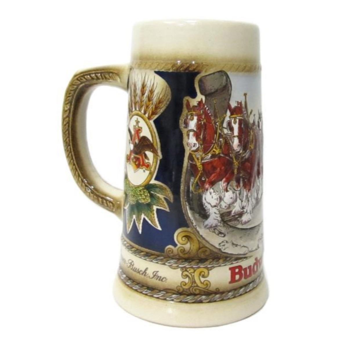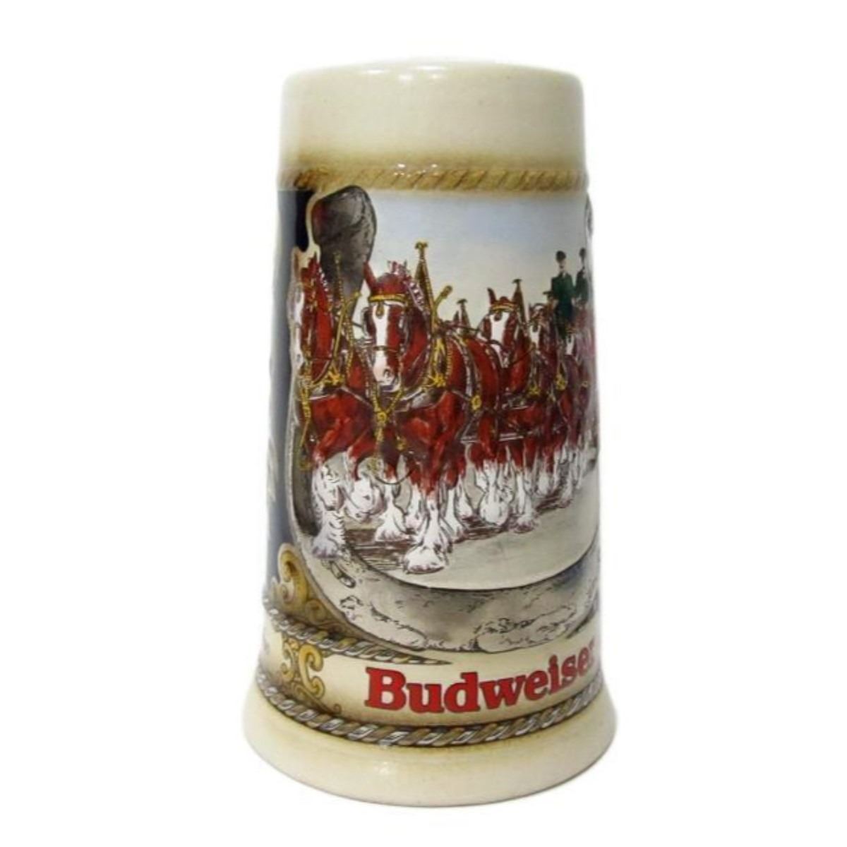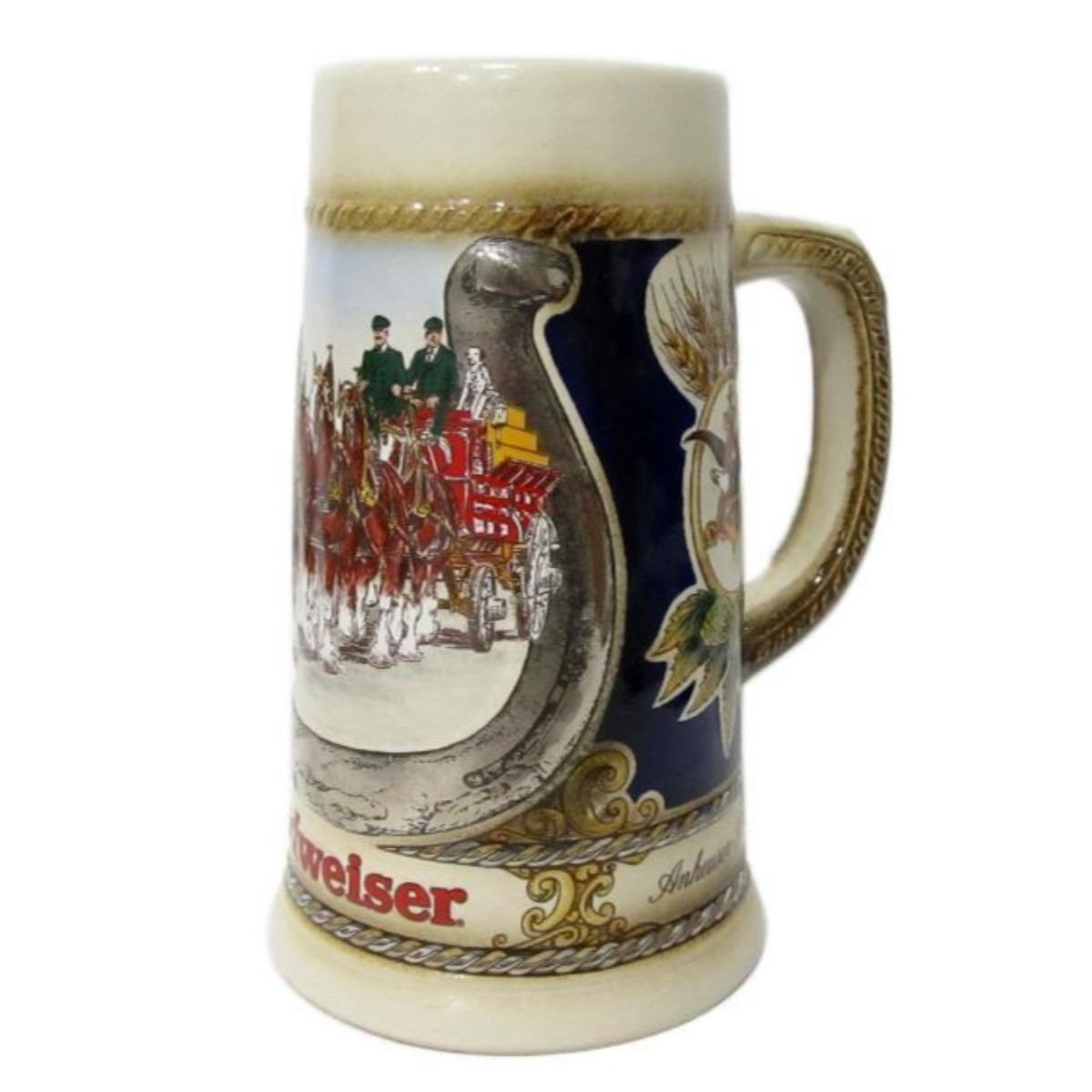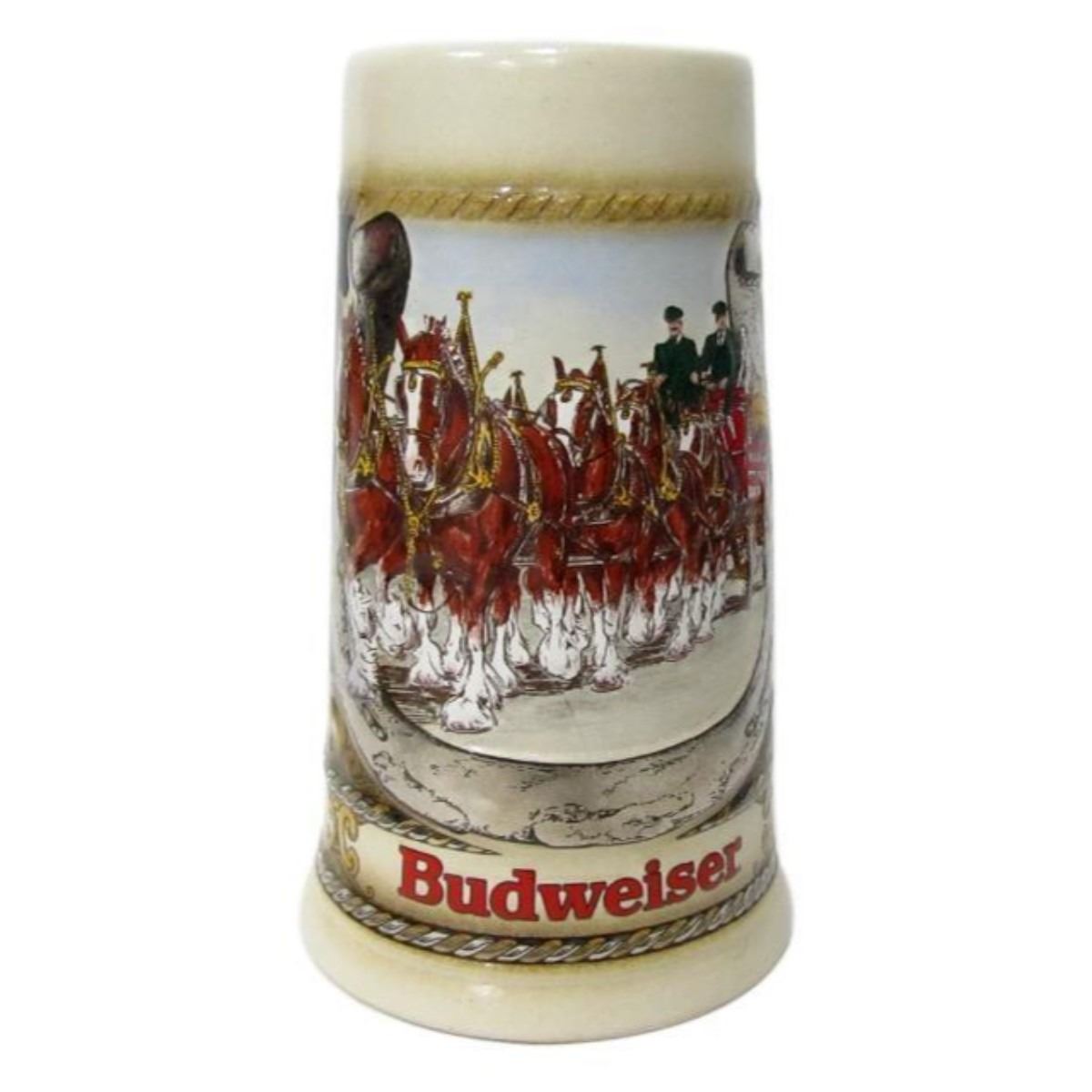 Vintage Budweiser German Staffel Stoneware advertising stein. Features the Budweiser Clydesdales with a metallic horseshoe surrounding them. 6 3/4" H X 4" base diameter. Makers mark - StaffelStoneware West Germany. Good condition.