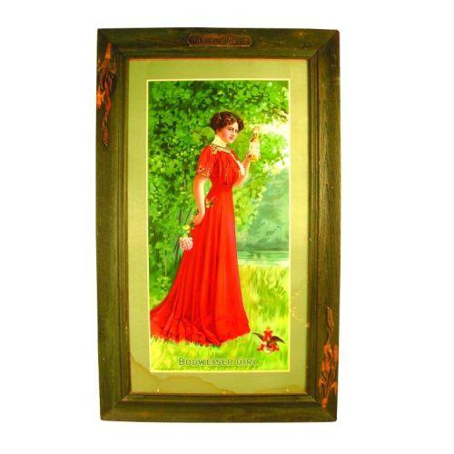 Budweiser Girl Cardboard Sign, Original Frame, some stains and scratches mostly to the outside border and damage to Gesso on the Frame otherwise good condition, over all measurements 23 1/2 x 38 1/2 inches.