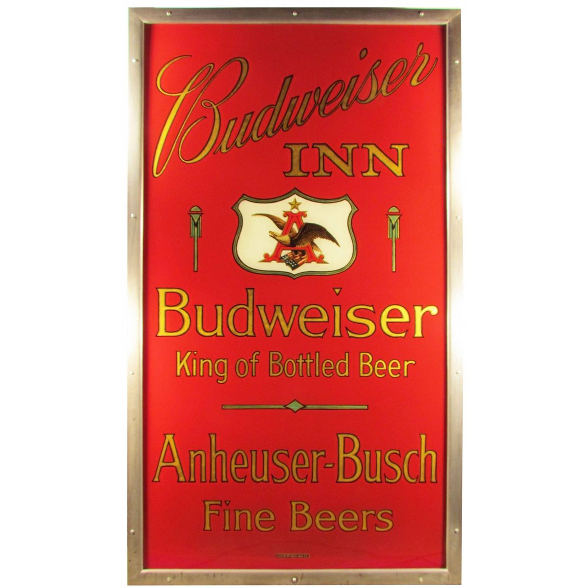 Budweiser Inn Reverse Glass Sign. With Eagle symbol. Budweiser, "King of Beers". Anheuser-Busch. General Outdoor Adv. and Co. Maker. Excellent Condition. 36 X 62 inches.