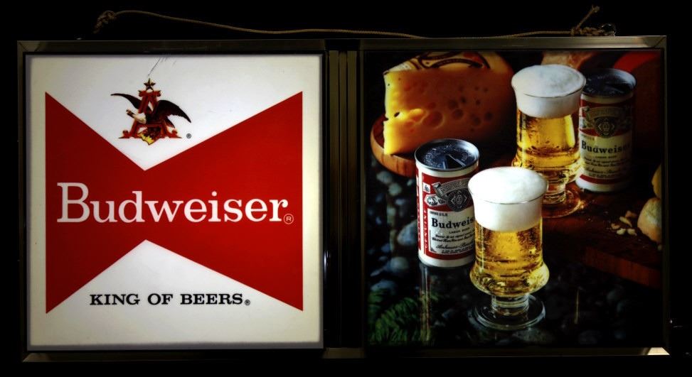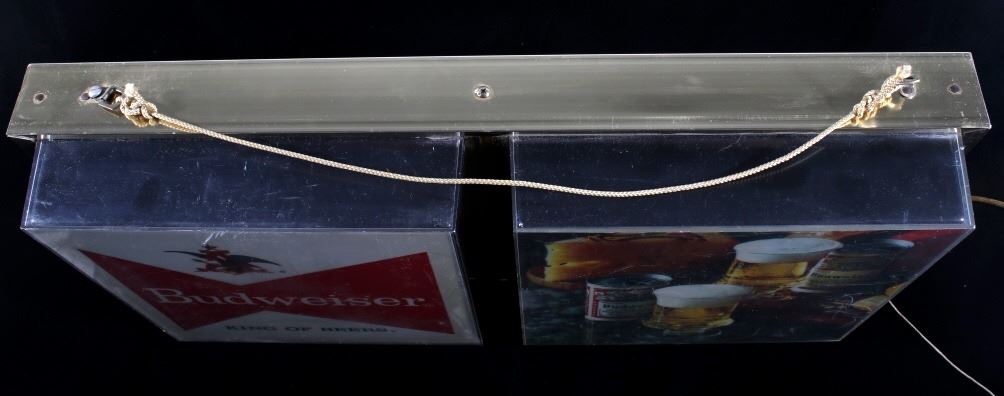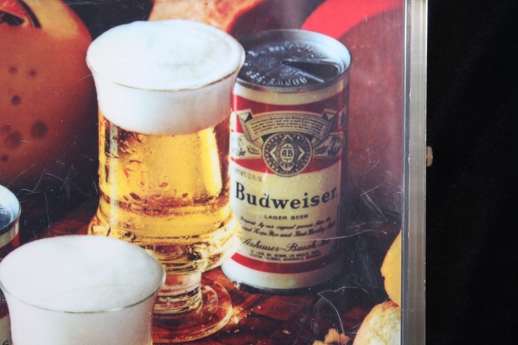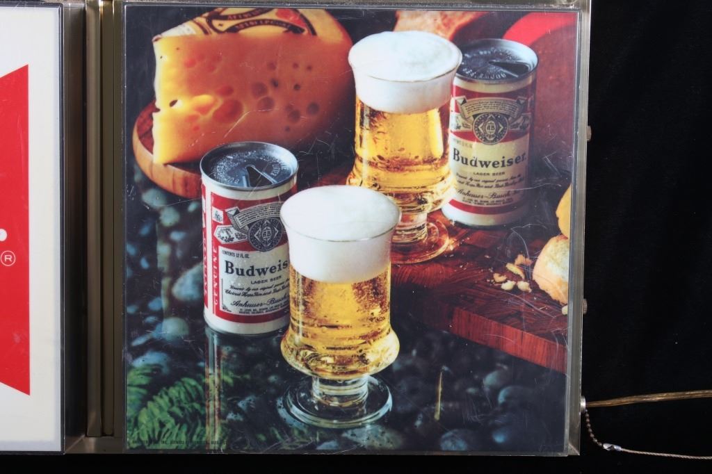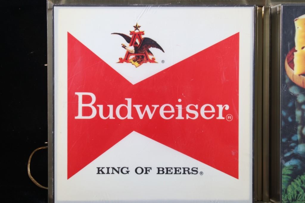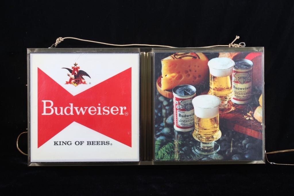 Included in this lot we have a Budweiser King of Beers advertising wall light originating from the 1960's to 70's. This advertising light shows two light up section. The first section shows the red and white Budweiser logo reading "Budweiser King of Beers" with the Anheuser-Busch eagle logo towards the top. The second section shows the top of a table with platters of cheese and bread and two cans of Budweiser next to filled glasses. The sections are set into a brass frame and are designed to be lit from the back. The piece shows good condition overall with the lights in working order. The piece measures 24 1/2" wide by 12 1/4" tall and 4 1/2" deep.