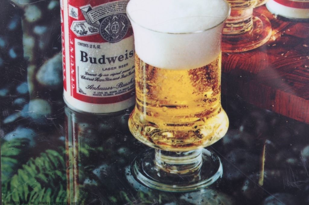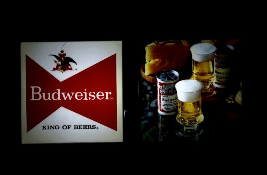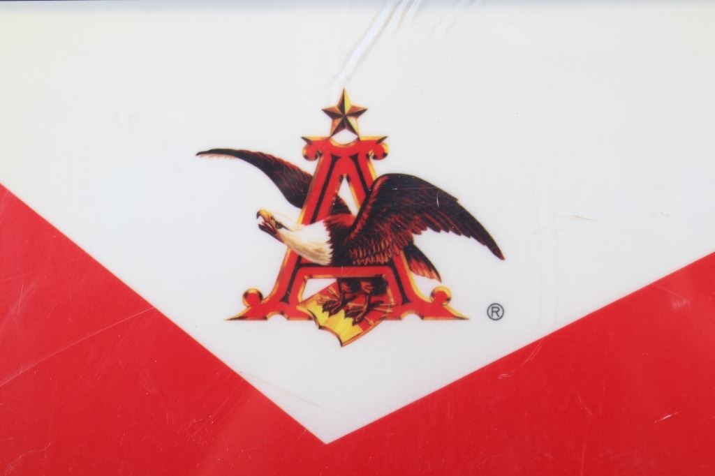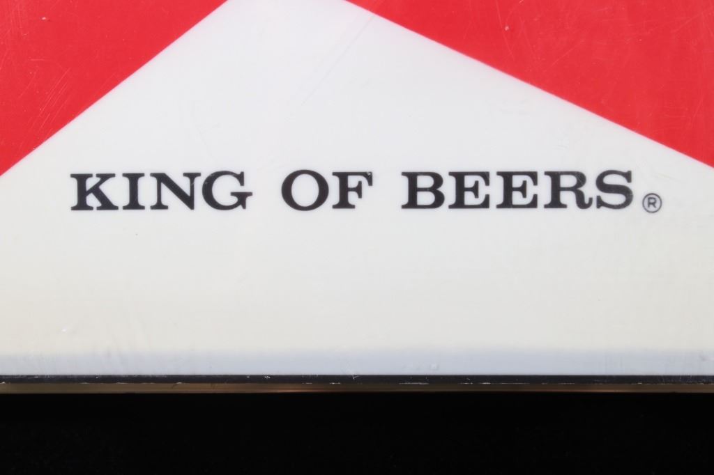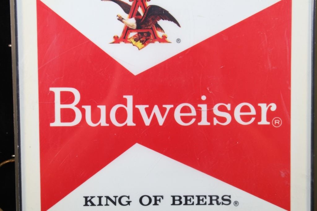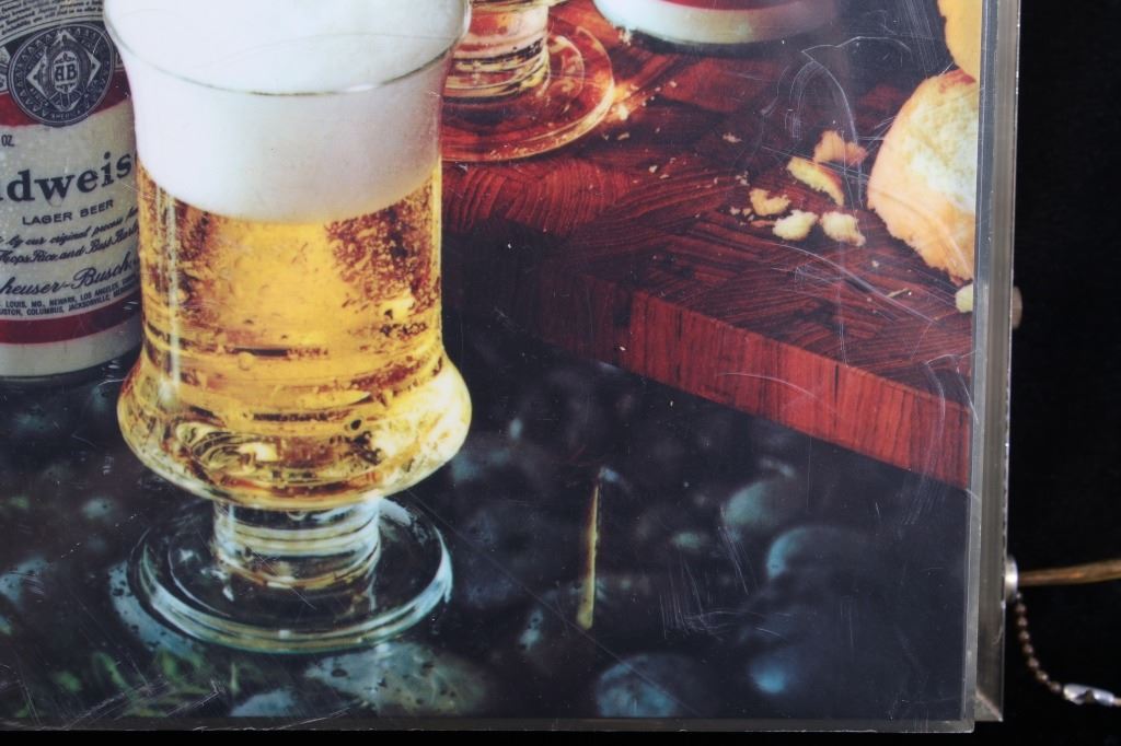Included in this lot we have a Budweiser King of Beers advertising wall light originating from the 1960's to 70's. This advertising light shows two light up section. The first section shows the red and white Budweiser logo reading "Budweiser King of Beers" with the Anheuser-Busch eagle logo towards the top. The second section shows the top of a table with platters of cheese and bread and two cans of Budweiser next to filled glasses. The sections are set into a brass frame and are designed to be lit from the back. The piece shows good condition overall with the lights in working order. The piece measures 24 1/2" wide by 12 1/4" tall and 4 1/2" deep.