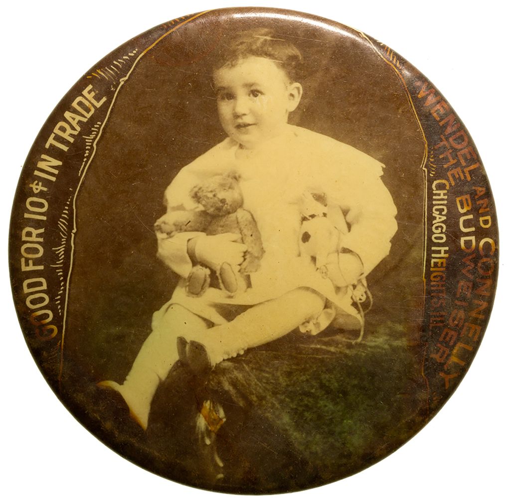 A child holding a teddy bear. Mirror reads; GOOD FOR 10 CENTS IN TRADE WENDEL AND CONNELLY THE BUDWEISER, CHICAGO HEIGHTS. There is wear on the mirror, it is broken in several pieces and has rust stains. - HKA#65802