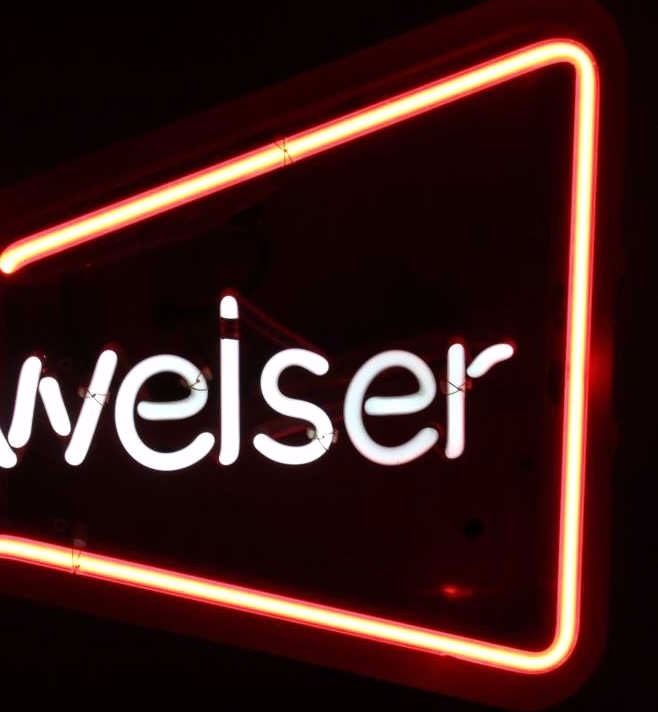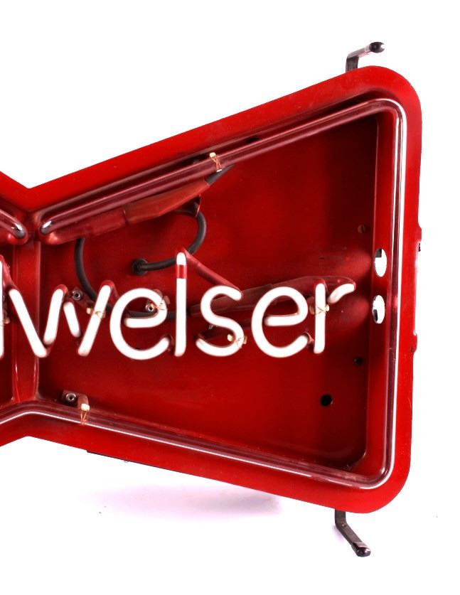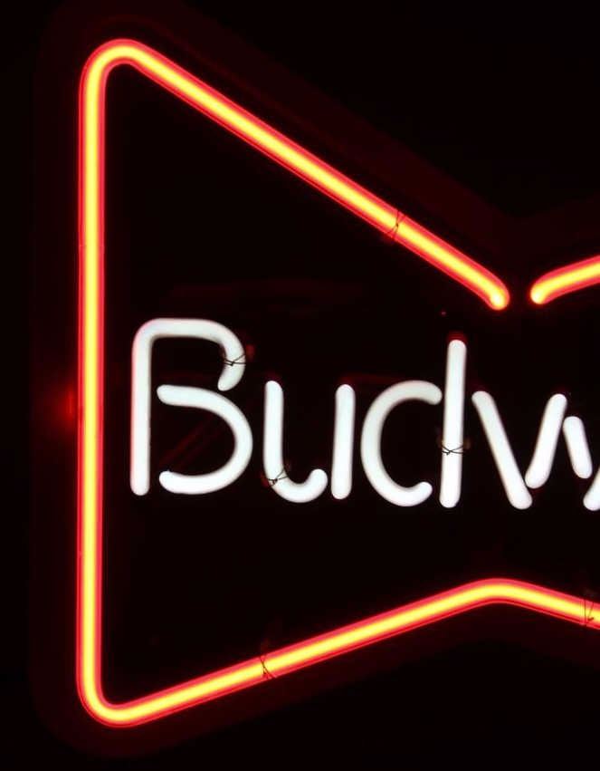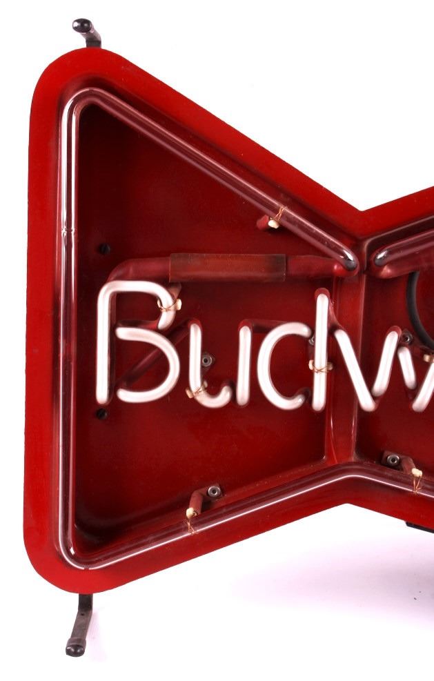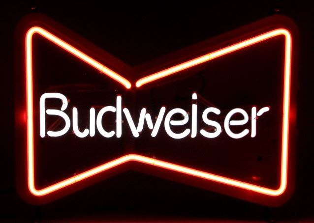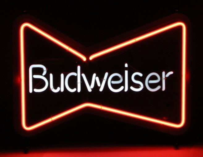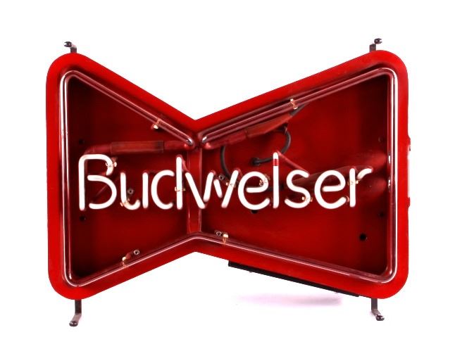 This is a Budweiser neon light advertising sign. The sign shows the Budweiser bowtie logo in neon with the stylized lettering. The neon sign is in good condition with bright, vivid colors. The sign measures 14.5" x 18.75".