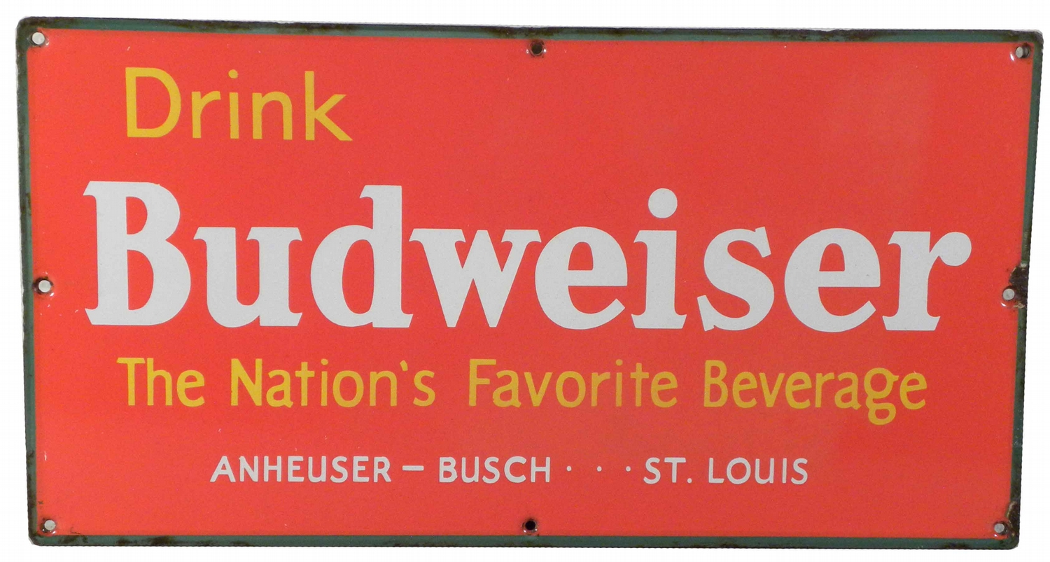Budweiser Porcelain Sign. Slight edge ware otherwise excellent condition. 21 X 11 inches.