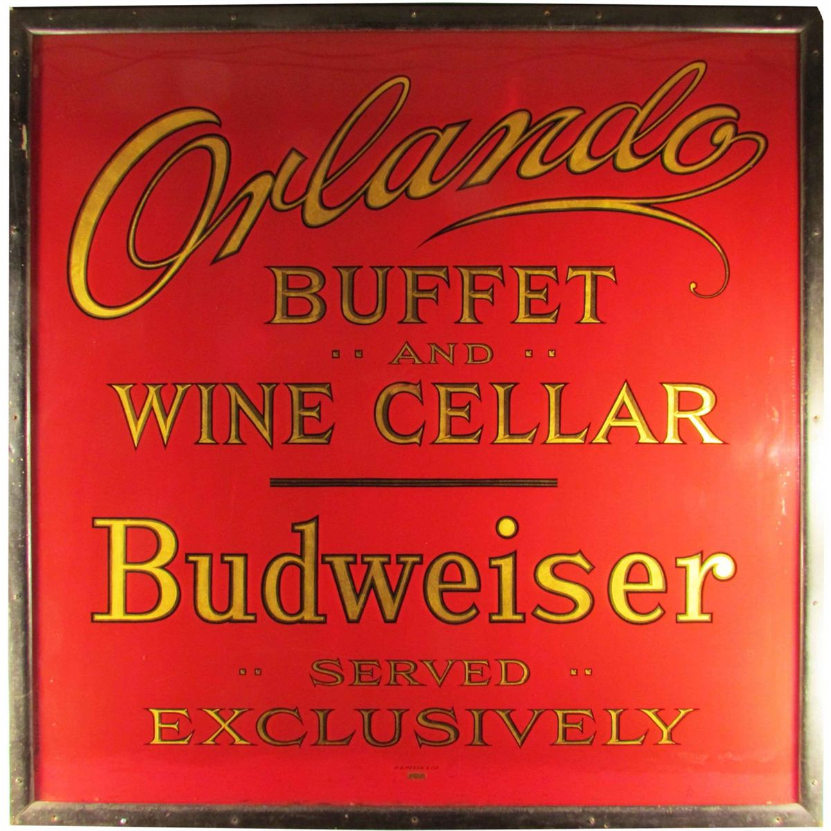 Budweiser Sign for Orlando Buffet & Wine Cellar. Budweiser Served Exclusively with All High-Grade Liquors. R. S. Meech & Co. Maker. Excellent condition. 36 X 62 inches.