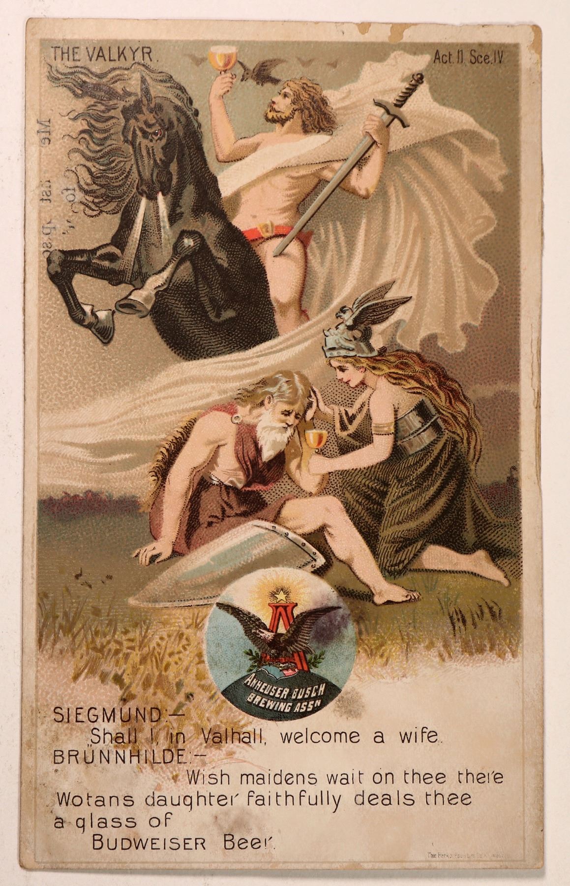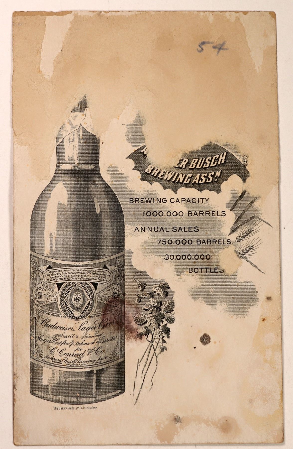 Rare Anheuser Busch, Budweiser Beer trade card. Album mounting paper on verso, slight upper front paper loss, lower front foxing. Please inspect. [