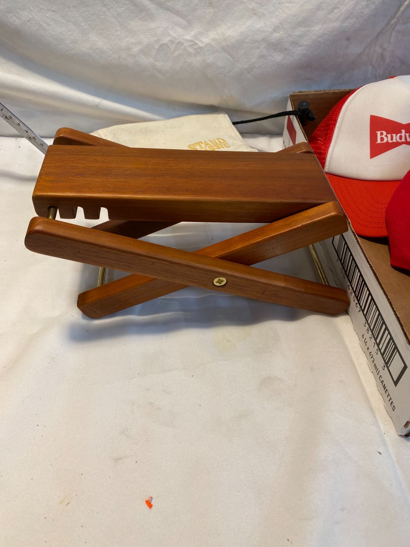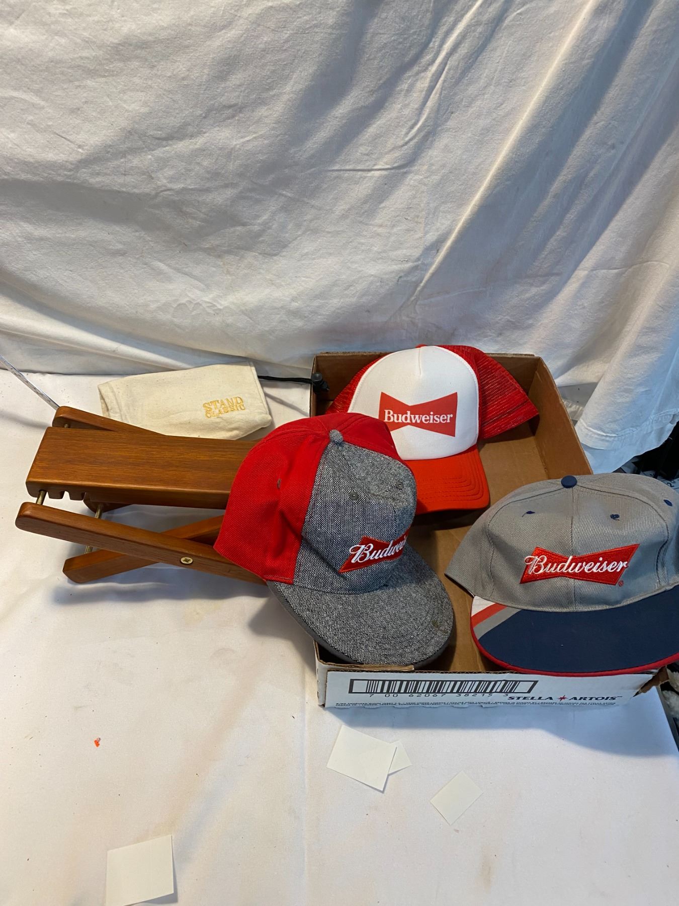 Budweiser caps and a stand