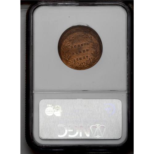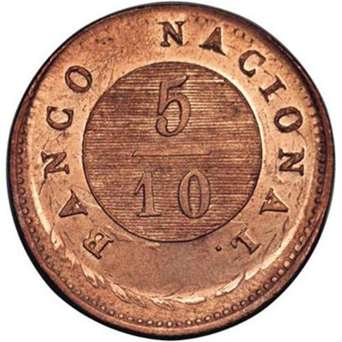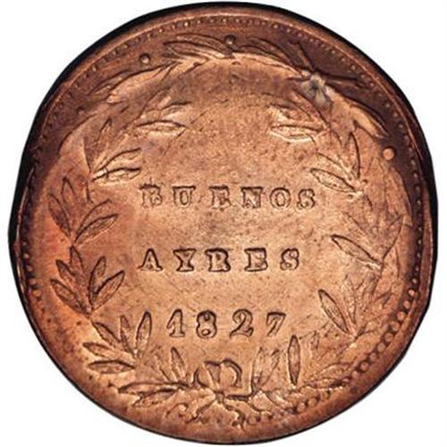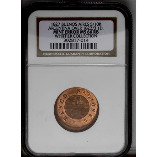 <B>Buenos Aires. 5/10 Real 1827, </B></I>KM3, MS66 NGC Red & Brown, struck over an earlier Decimo (1822-3), and slightly off-center as is often the case for this type. Although designated "red & brown" by NGC this coin is fully lustrous and quite spectacular for a copper coin from this era of provincial coinage.