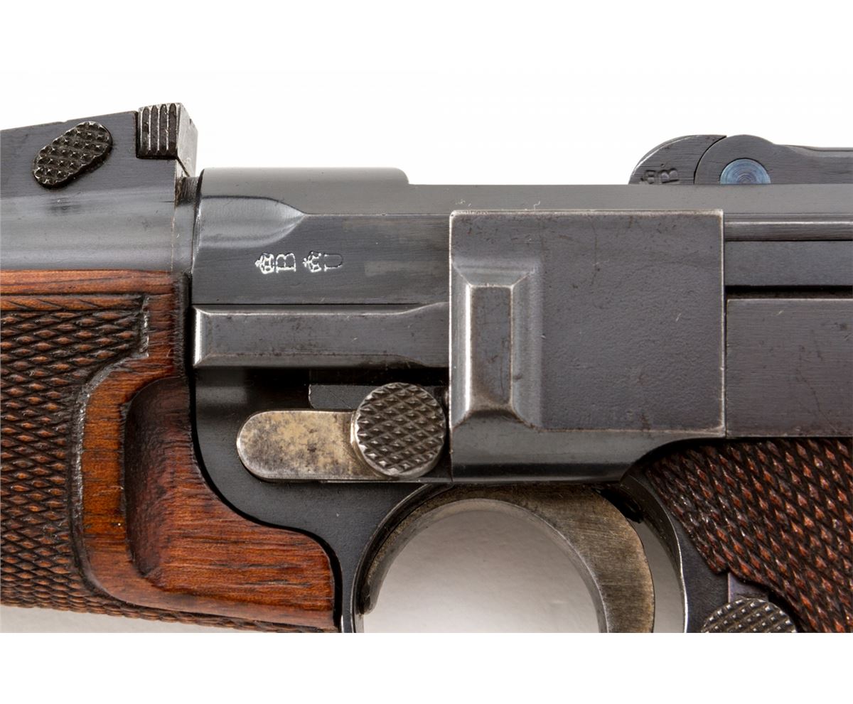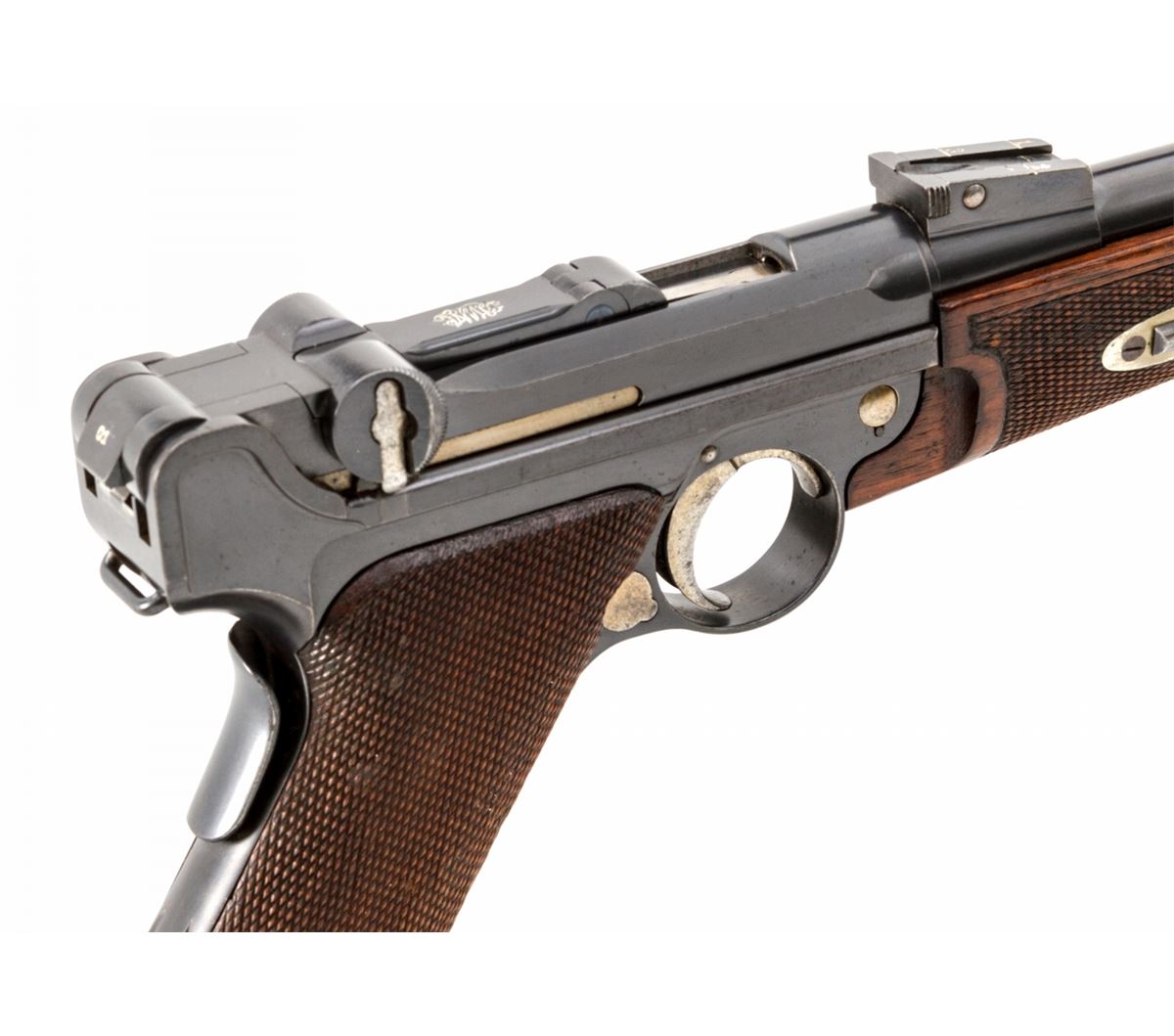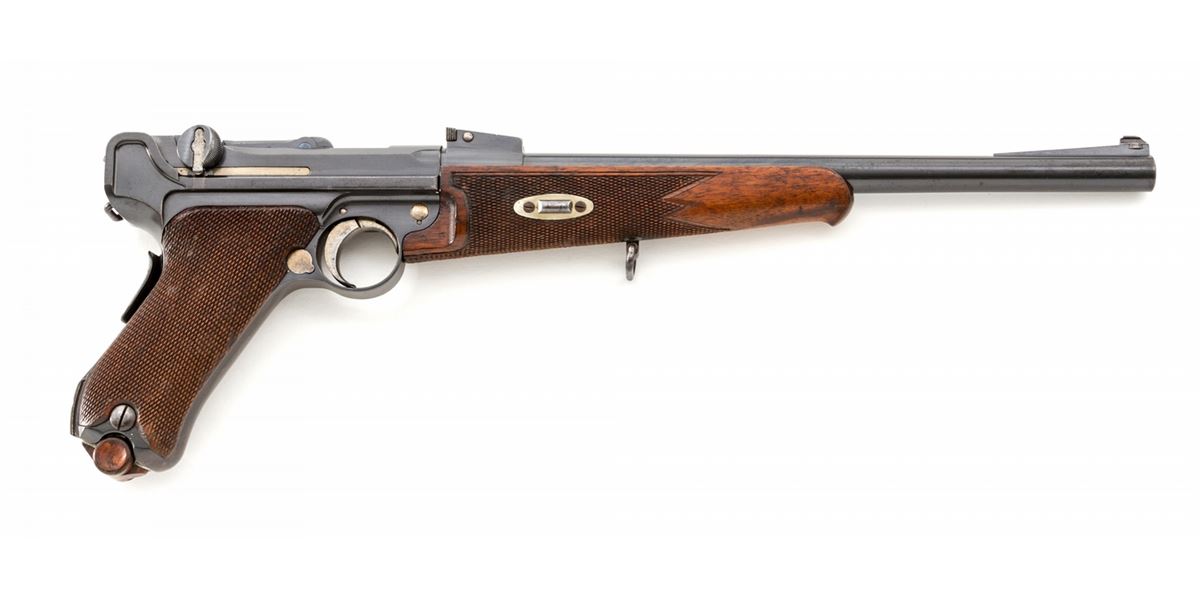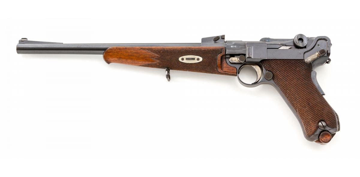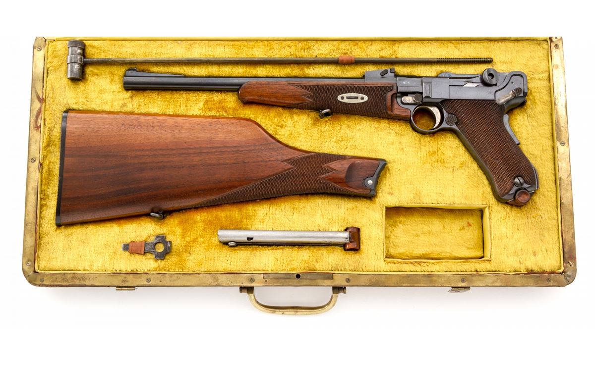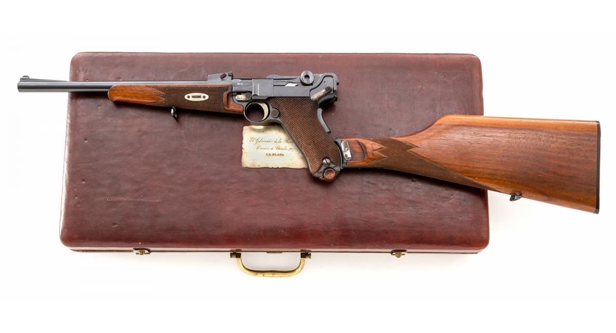 Buenos Aires Retailer marked 1902 Luger Carbine, in original 1907 dated presentation case, #24601, .30 Luger cal., 11-3/4'' barrel, blue finish with straw small parts, factory checkered walnut grips, matching numbered checkered forend and stock, with two unmarked nickel-plated magazines with walnut bases, as well as a combination cleaning rod/oiler, and Imperial marked combination tool. Top of barrel marked ''J. Canedo/611 Rivadivia, 611/Bs Aires''. Chamber is blank, DWM marked toggle, lower portion of thumb safety polished bright, scalloped toggle knobs, grip safety, 3-position rear sight, ramped gold bead front sight. Matching numbered walnut stock with horn buttplate and fire blue screws. Silver plaque to lid of case period inscribed ''El Gobernador de la Provincia/Concurso de Setiembre 1907/la Plata'' (Governor of the Province/Contest of September 1907/The Silver). Left side of upper frame with ''(crown)/B'' and ''U'' proofmarks, with BUG markings to bottom of barrel. Condition is excellent retaining approx. 97% lightly thinning and toning blue showing some possible touchup to forward portion of barrel. Grips with minor flattening and light impressions; stock and forend show less pronounced flattening with minor impressions to both sides of smooth portion of stock. Horn buttplate with some areas of loss and minor worming. Action is crisp, bore is very good with some frosting in the grooves. Plaque to top of case with minor patination. Brown leather covering shows light surface wear. Goldenrod interior with light soiling. A beautiful South American retailed Luger Carbine that was probably awarded in a shooting competition. Est.: $20,000-$30,000. (C&R/PPT) (John Siroonian estate)