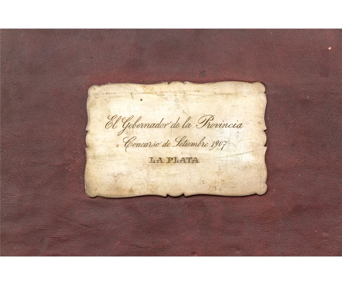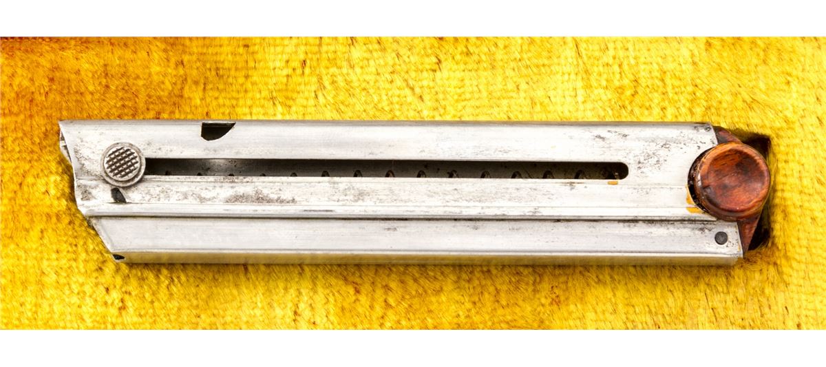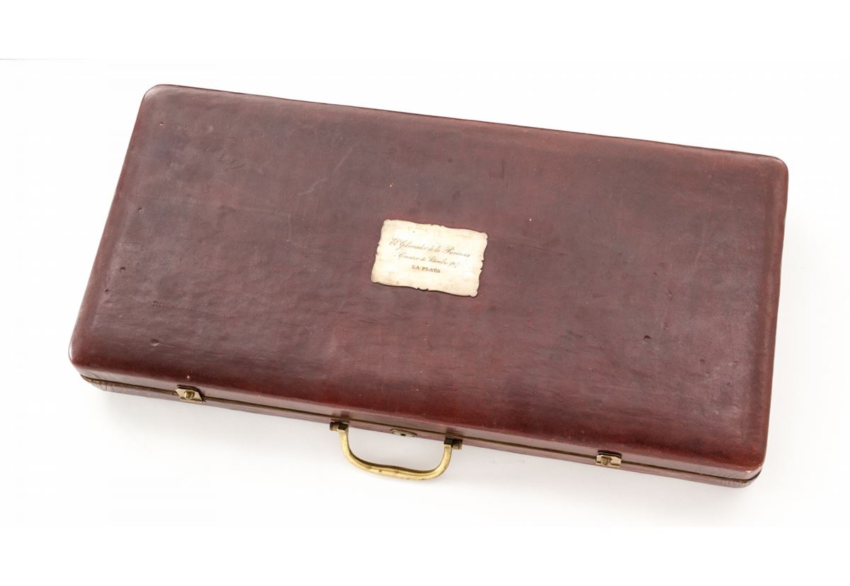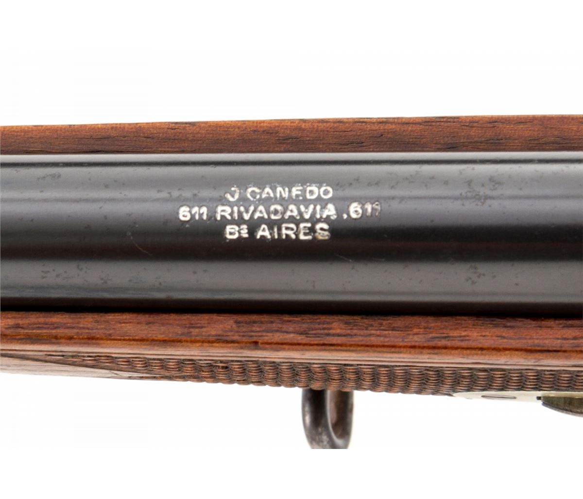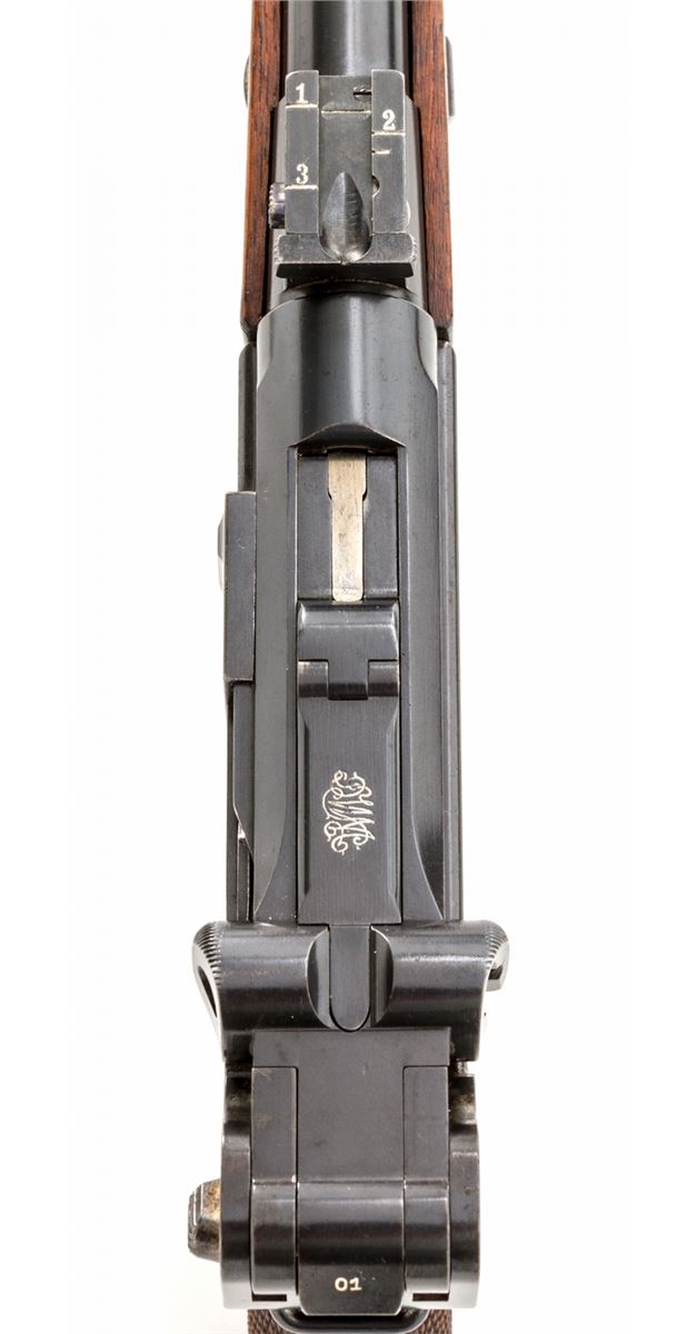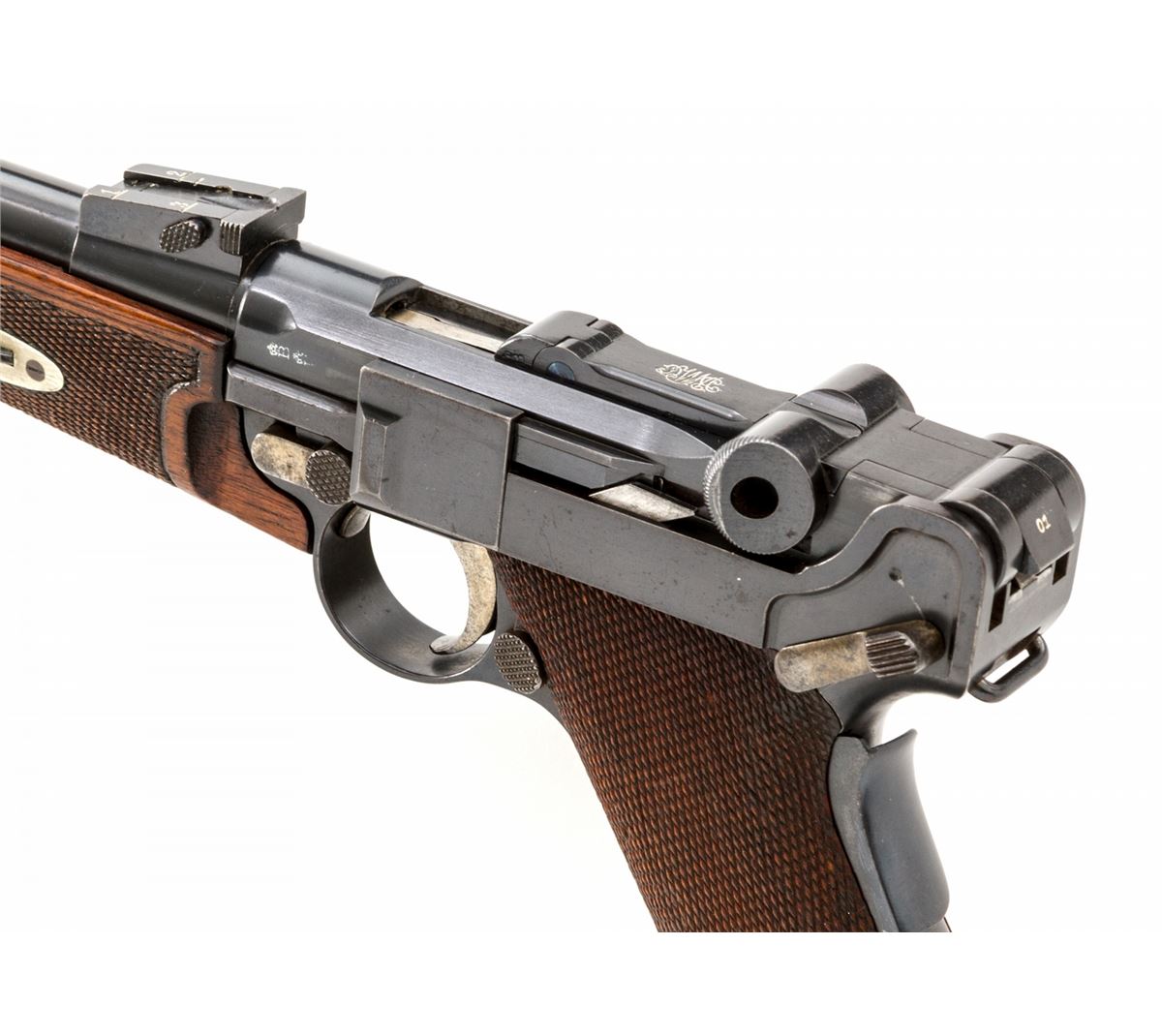 Buenos Aires Retailer marked 1902 Luger Carbine, in original 1907 dated presentation case, #24601, .30 Luger cal., 11-3/4'' barrel, blue finish with straw small parts, factory checkered walnut grips, matching numbered checkered forend and stock, with two unmarked nickel-plated magazines with walnut bases, as well as a combination cleaning rod/oiler, and Imperial marked combination tool. Top of barrel marked ''J. Canedo/611 Rivadivia, 611/Bs Aires''. Chamber is blank, DWM marked toggle, lower portion of thumb safety polished bright, scalloped toggle knobs, grip safety, 3-position rear sight, ramped gold bead front sight. Matching numbered walnut stock with horn buttplate and fire blue screws. Silver plaque to lid of case period inscribed ''El Gobernador de la Provincia/Concurso de Setiembre 1907/la Plata'' (Governor of the Province/Contest of September 1907/The Silver). Left side of upper frame with ''(crown)/B'' and ''U'' proofmarks, with BUG markings to bottom of barrel. Condition is excellent retaining approx. 97% lightly thinning and toning blue showing some possible touchup to forward portion of barrel. Grips with minor flattening and light impressions; stock and forend show less pronounced flattening with minor impressions to both sides of smooth portion of stock. Horn buttplate with some areas of loss and minor worming. Action is crisp, bore is very good with some frosting in the grooves. Plaque to top of case with minor patination. Brown leather covering shows light surface wear. Goldenrod interior with light soiling. A beautiful South American retailed Luger Carbine that was probably awarded in a shooting competition. Est.: $20,000-$30,000. (C&R/PPT) (John Siroonian estate)
