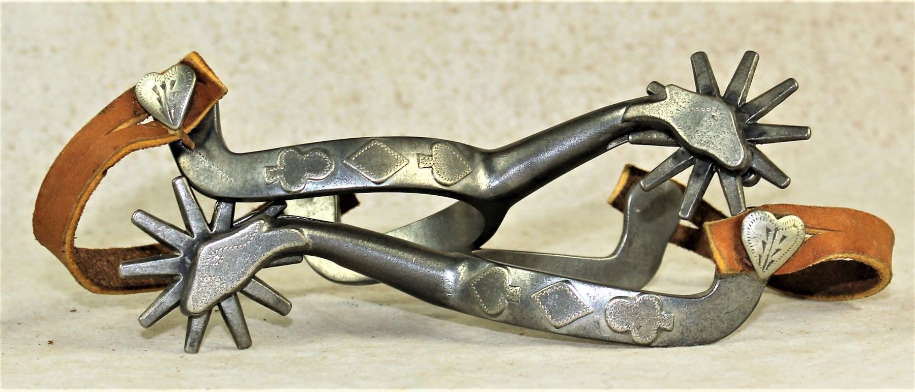 An uncommon pair of "Star Steel Silver" spurs, single mounted with engraved card suits, and eagle head shanks.