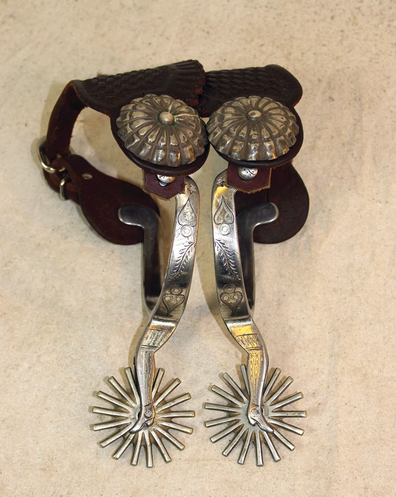 Crisp early unusual Buerman gal leg spurs with early AB mark, and having most of their original finish.