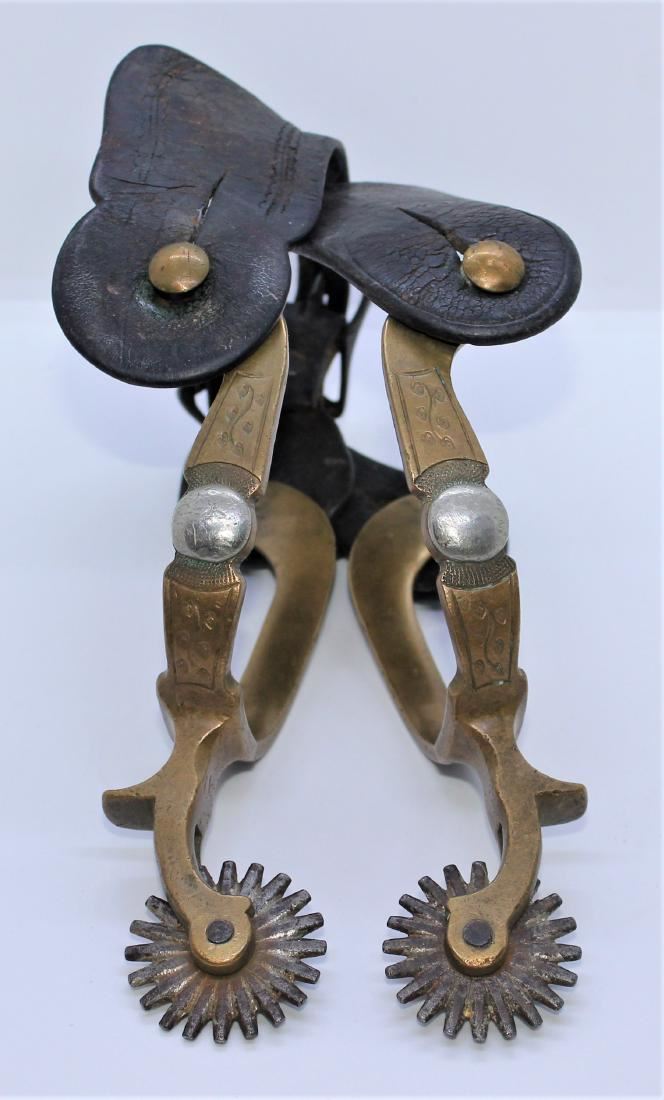 Nicely maker marked pattern #1284 spurs with single nickel dot heelbands, and original straps.