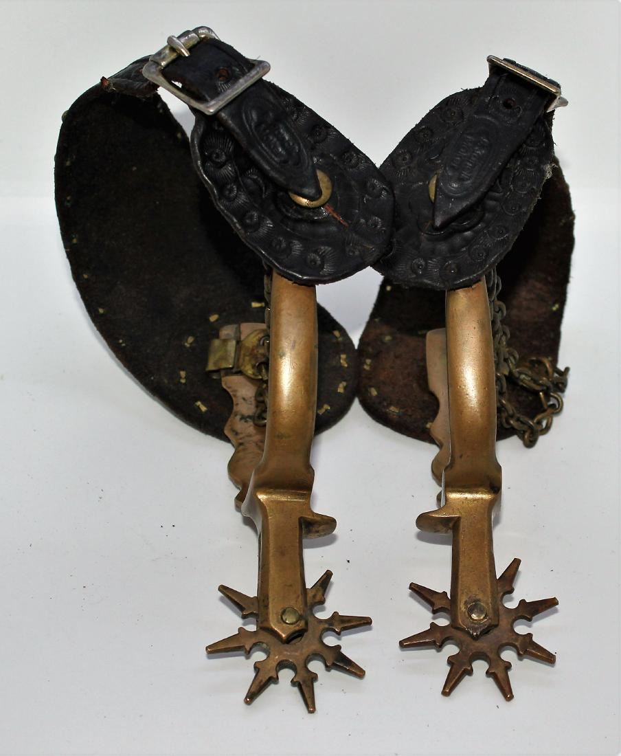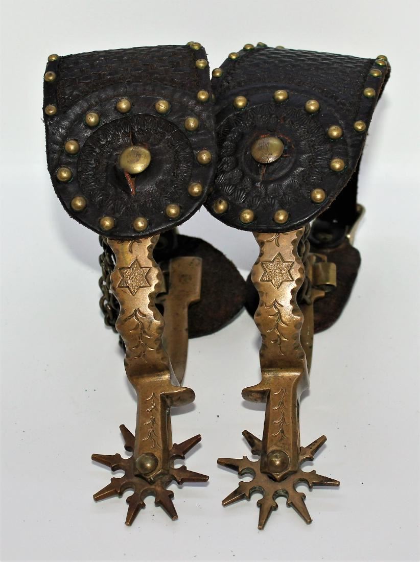 Crisp pair of deeply engraved #1280 star pattern spurs, with scalloped heelbands and fantastic snowflake rowels. Shown off by great brass studded straps.