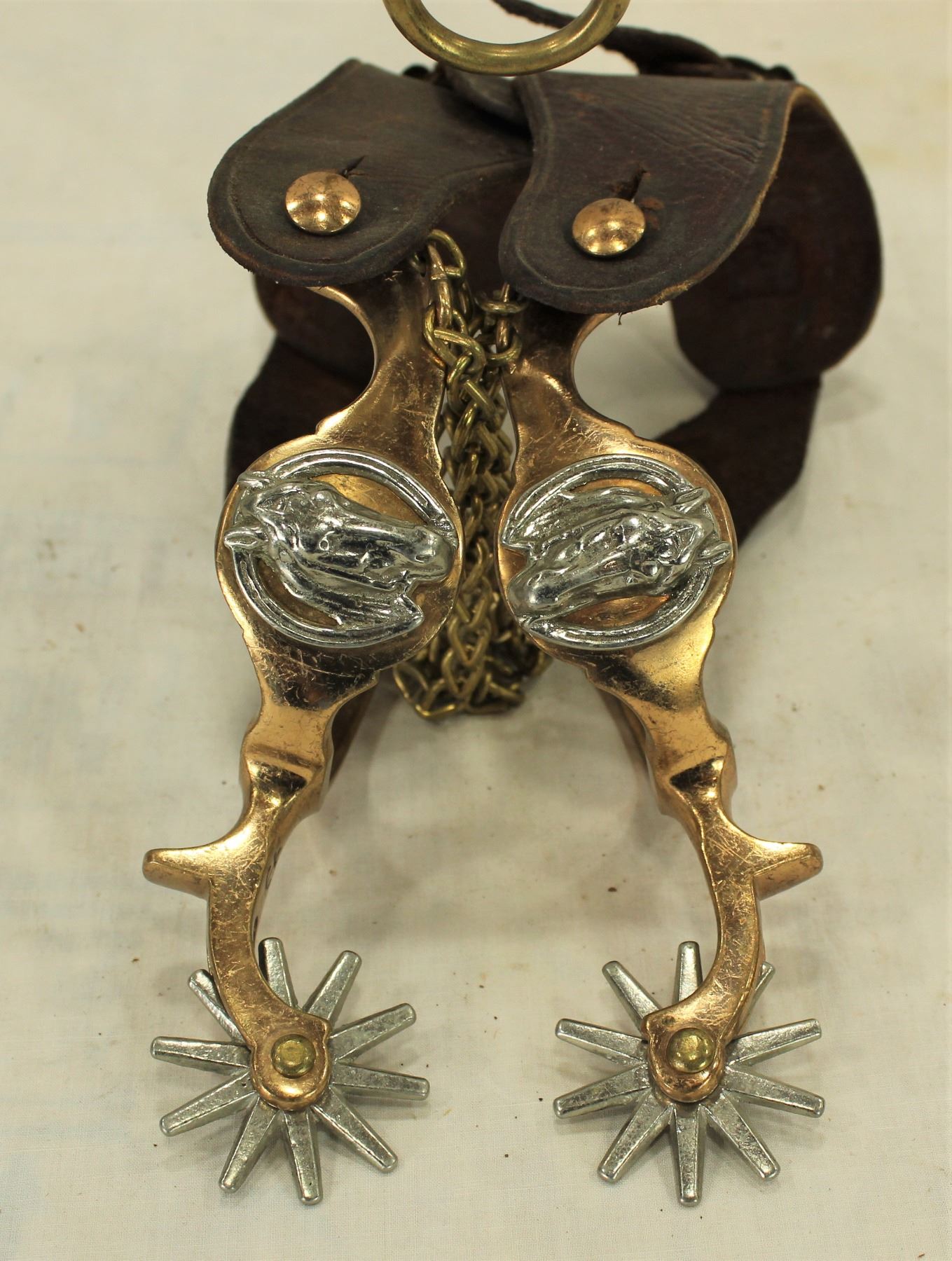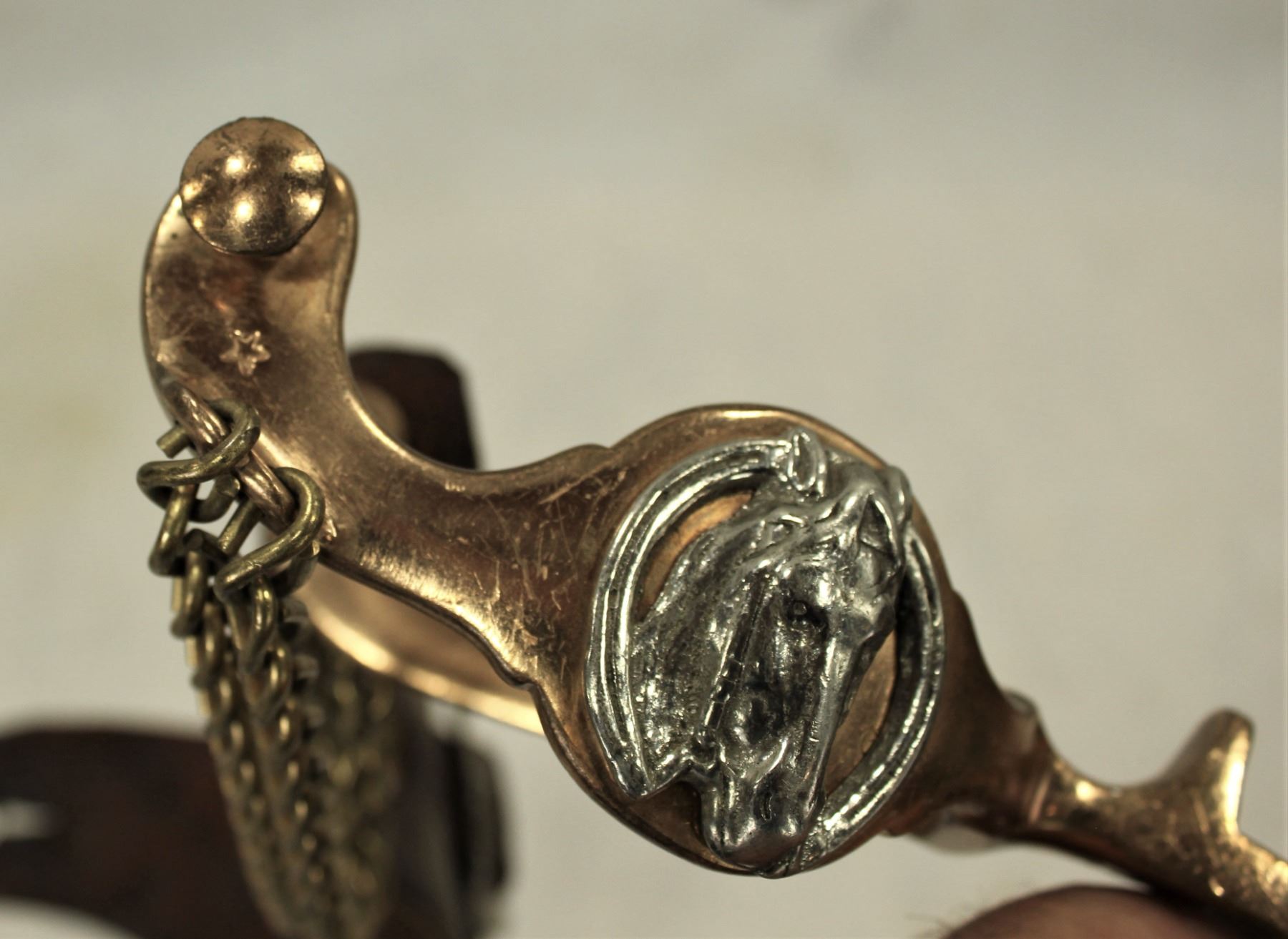 Nice matching set of Hercules bronze horsehead bit and spurs with straps.